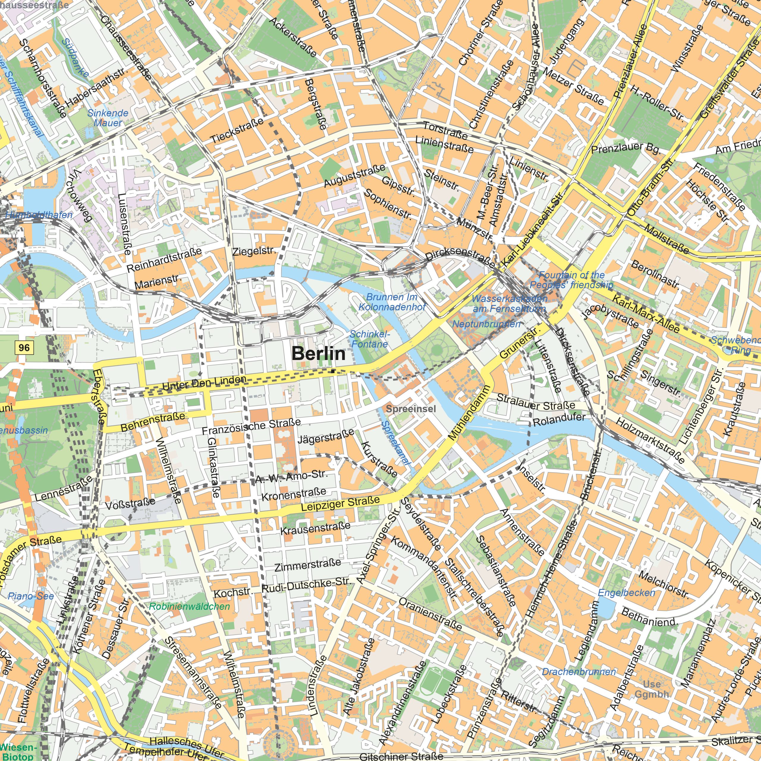 This detailed city map digital vector map presents Berlin in its full urban breadth, from the historic centre around Unter den Linden to districts such as Mitte, Kreuzberg and Charlottenburg. Streets, waterways, parks and public squares are clearly organised, offering a readable and well-structured view of the city. Green zones and open spaces are integrated alongside dense urban areas, reflecting Berlin’s layered development and varied cityscape. The map combines historical depth with contemporary urban structure, resulting in a clear and informative representation suitable for geographic reference, urban analysis and professional visual applications.