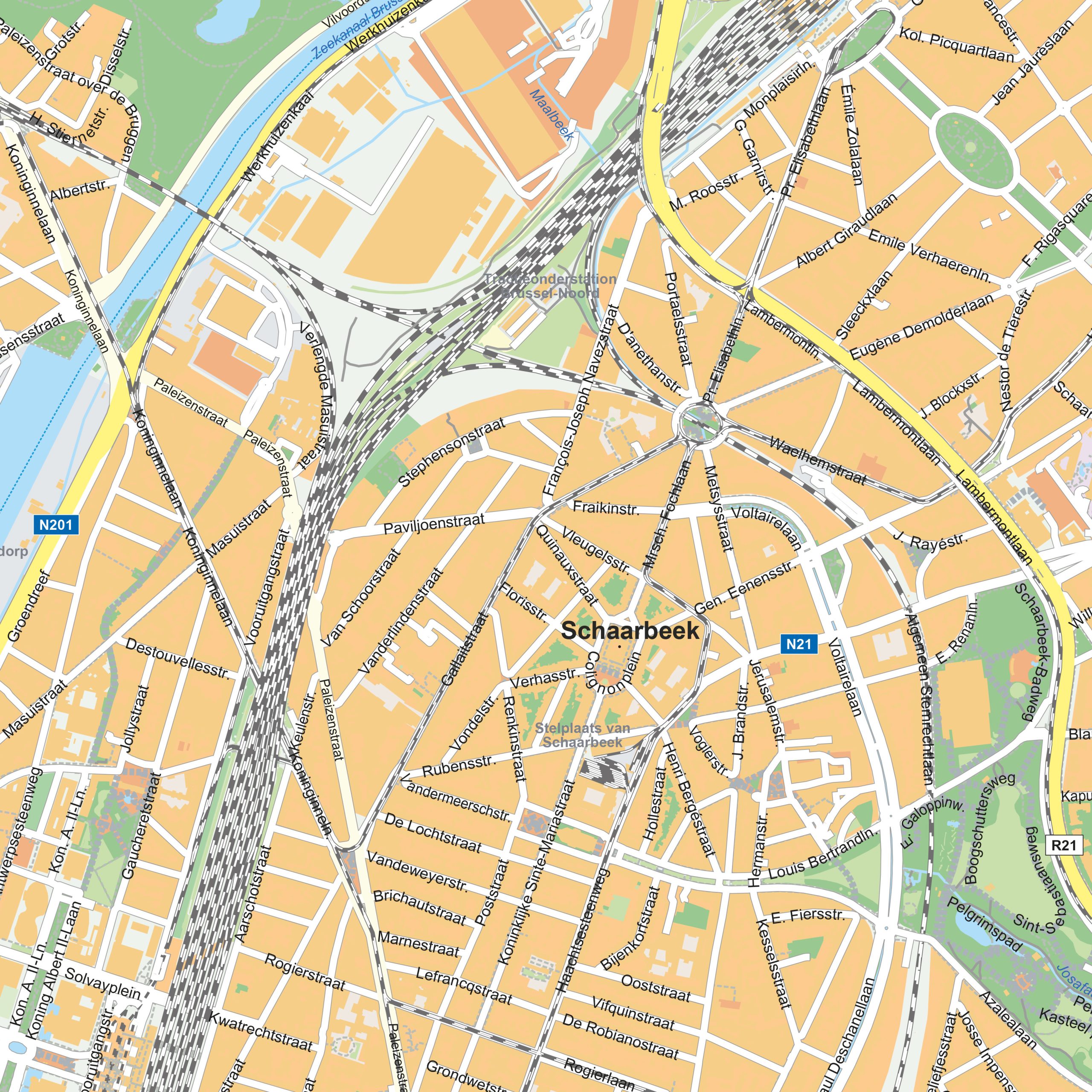 This detailed city map digital vector map presents the historic centre of Brussels, including well-known locations such as the Grand Place and the European Quarter. Narrow streets, major traffic routes and public squares are clearly structured, offering an accurate and readable view of the city’s compact urban layout. Green spaces, including central parks, are integrated into the map, providing balance between dense built areas and open zones. Cultural landmarks and museums are positioned within the street network, reflecting the layered character of the city. The clear design and consistent structure make the map suitable for geographic reference, urban analysis and professional visual applications.