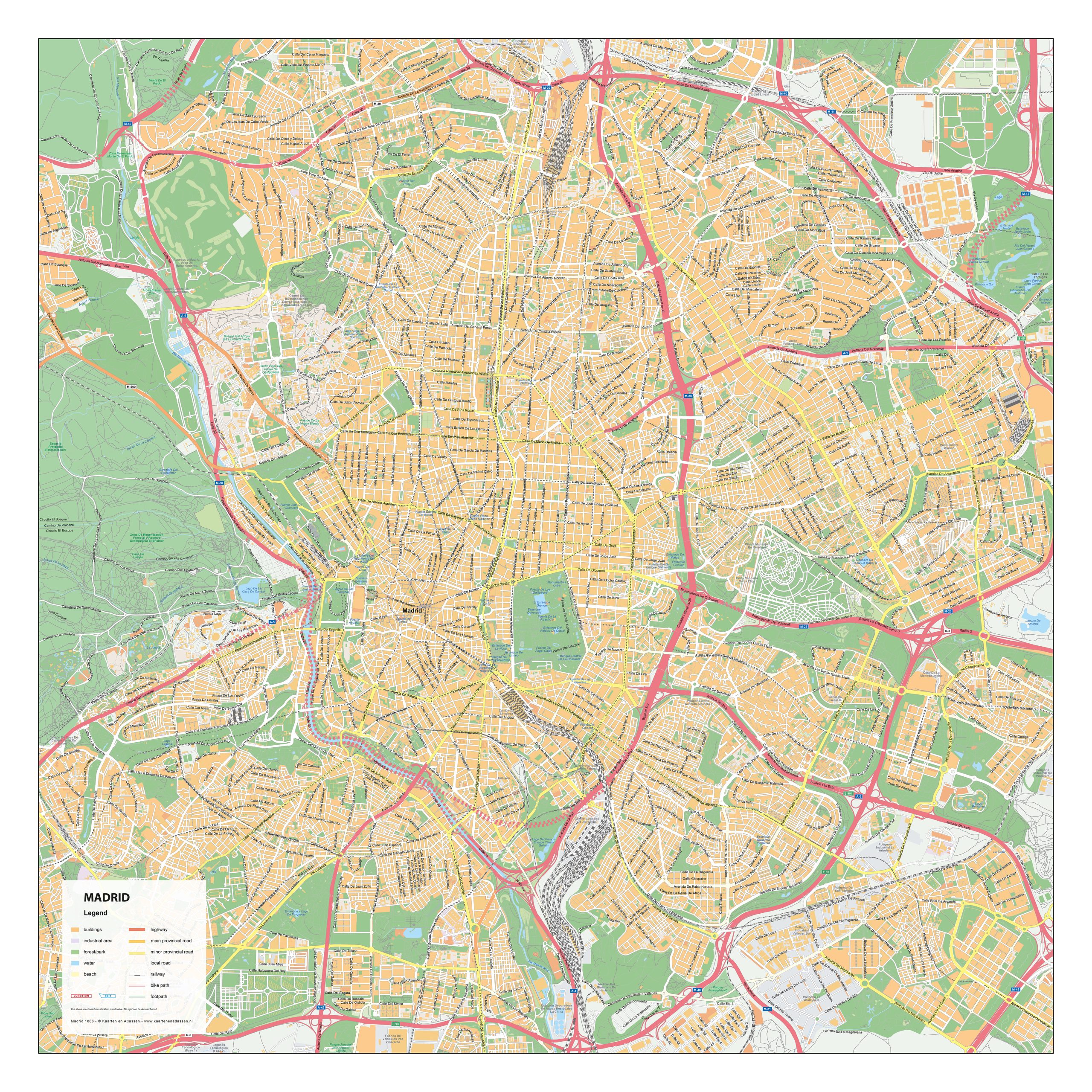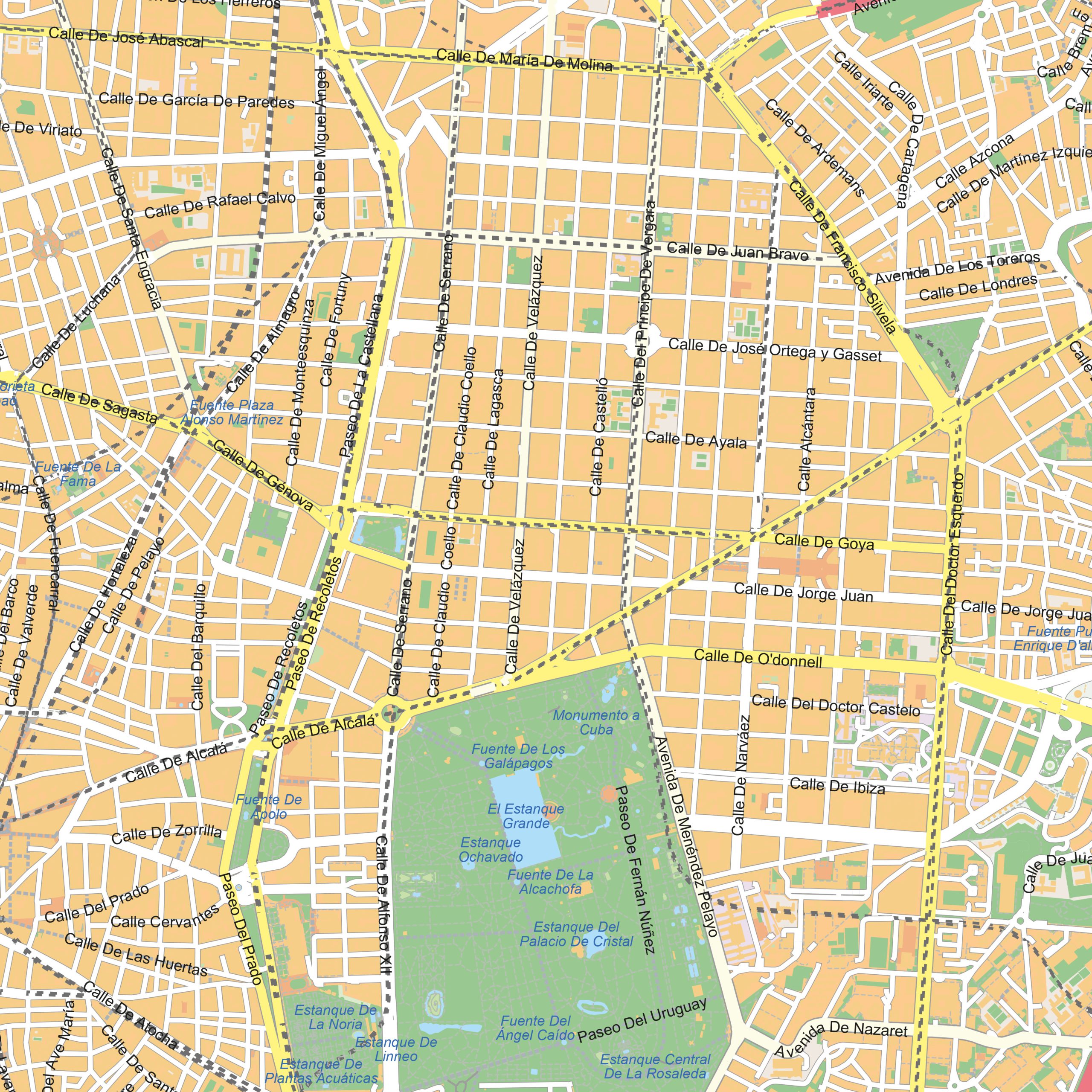 This detailed city map digital vector map focuses on the historic centre of Madrid, including well-known districts such as Sol, Gran Vía and La Latina. Streets, squares and public spaces are clearly structured, offering an accurate representation of the city’s urban layout. Parks and green areas are carefully integrated, while the Manzanares River provides a natural reference within the cityscape. The map combines a high level of detail with a balanced design, allowing complex city information to remain readable and well organised. Its clear structure makes it suitable for geographic reference, urban analysis and professional visual applications.
