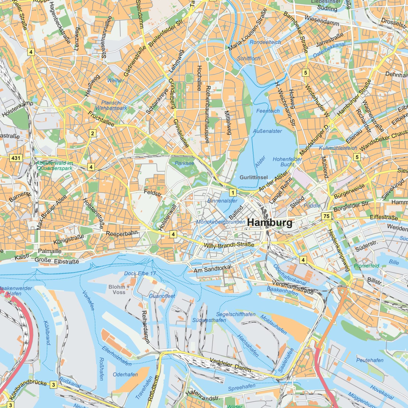 This detailed city map digital vector map presents Hamburg as a dynamic port city along the River Elbe, from the historic Speicherstadt and harbour areas to districts such as St. Pauli, Altona and Eimsbüttel. Streets, canals, waterways, parks and public squares are clearly organised, providing a readable and well-balanced view of the city’s complex urban structure. Water plays a prominent role throughout the map, reflecting Hamburg’s strong connection to trade, industry and maritime history. The combination of historic quarters, dense urban areas and open green spaces highlights the city’s layered development and spatial diversity. The clear composition makes the map suitable for geographic reference, urban analysis and professional visual applications.