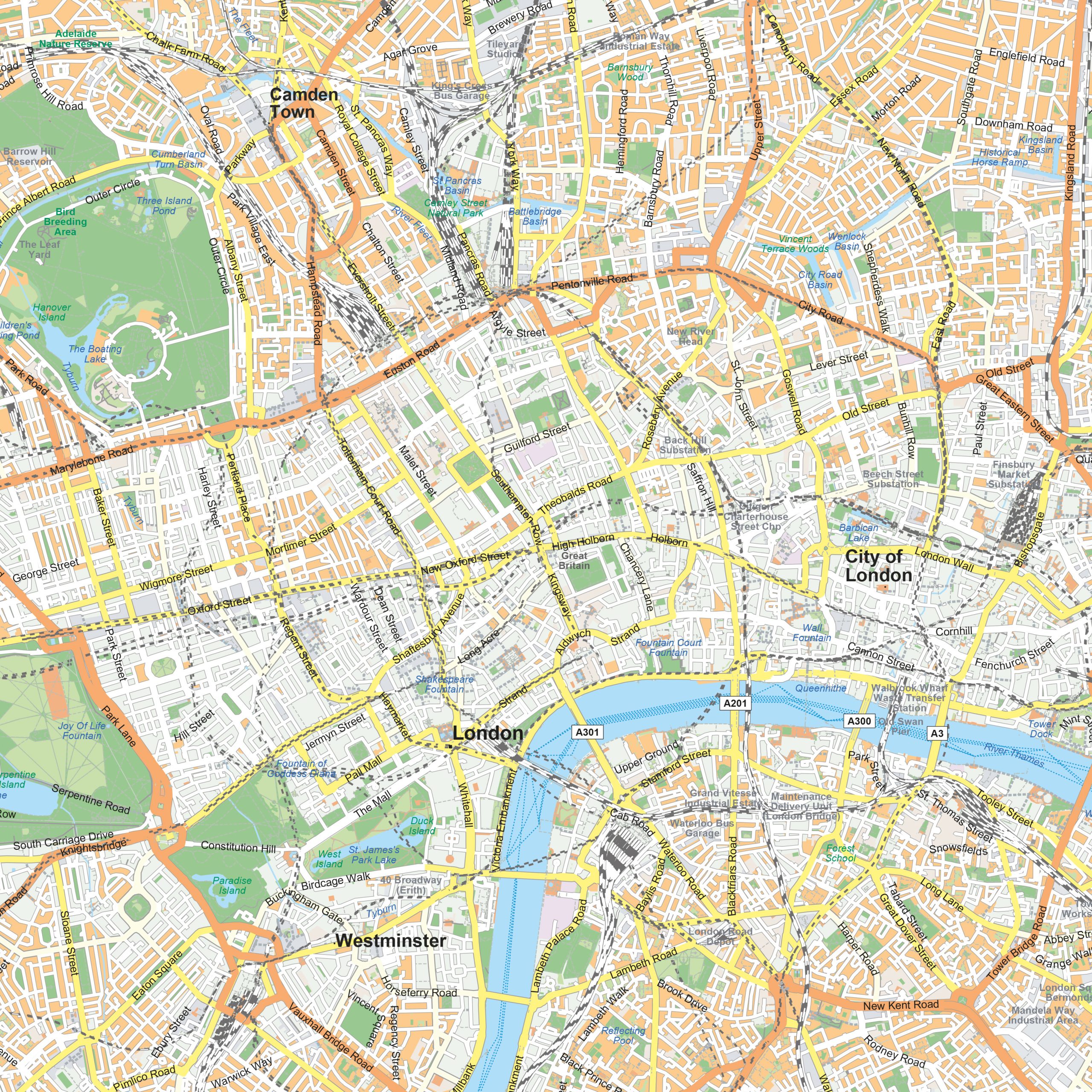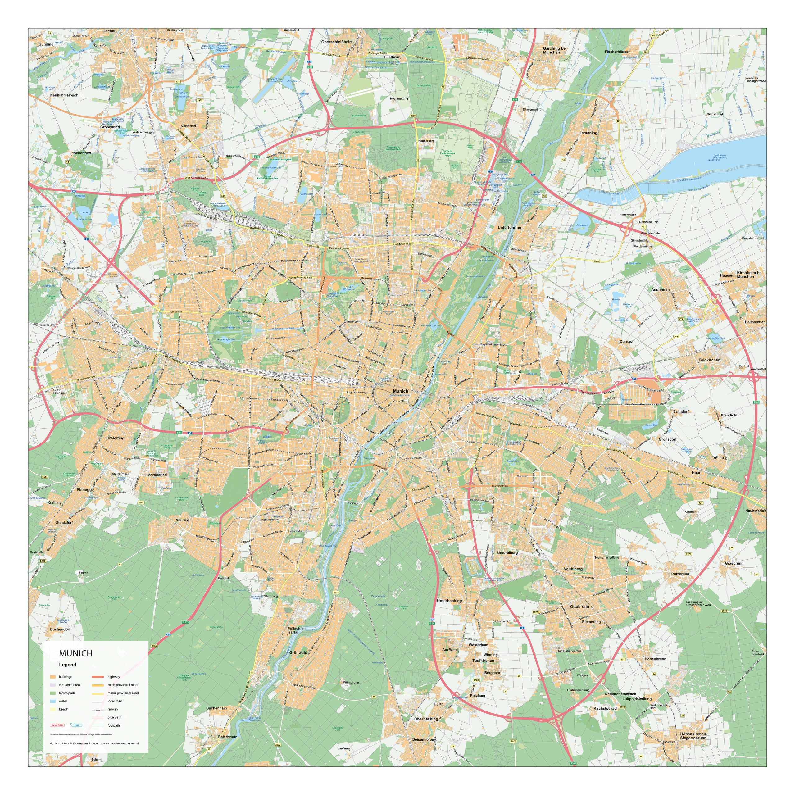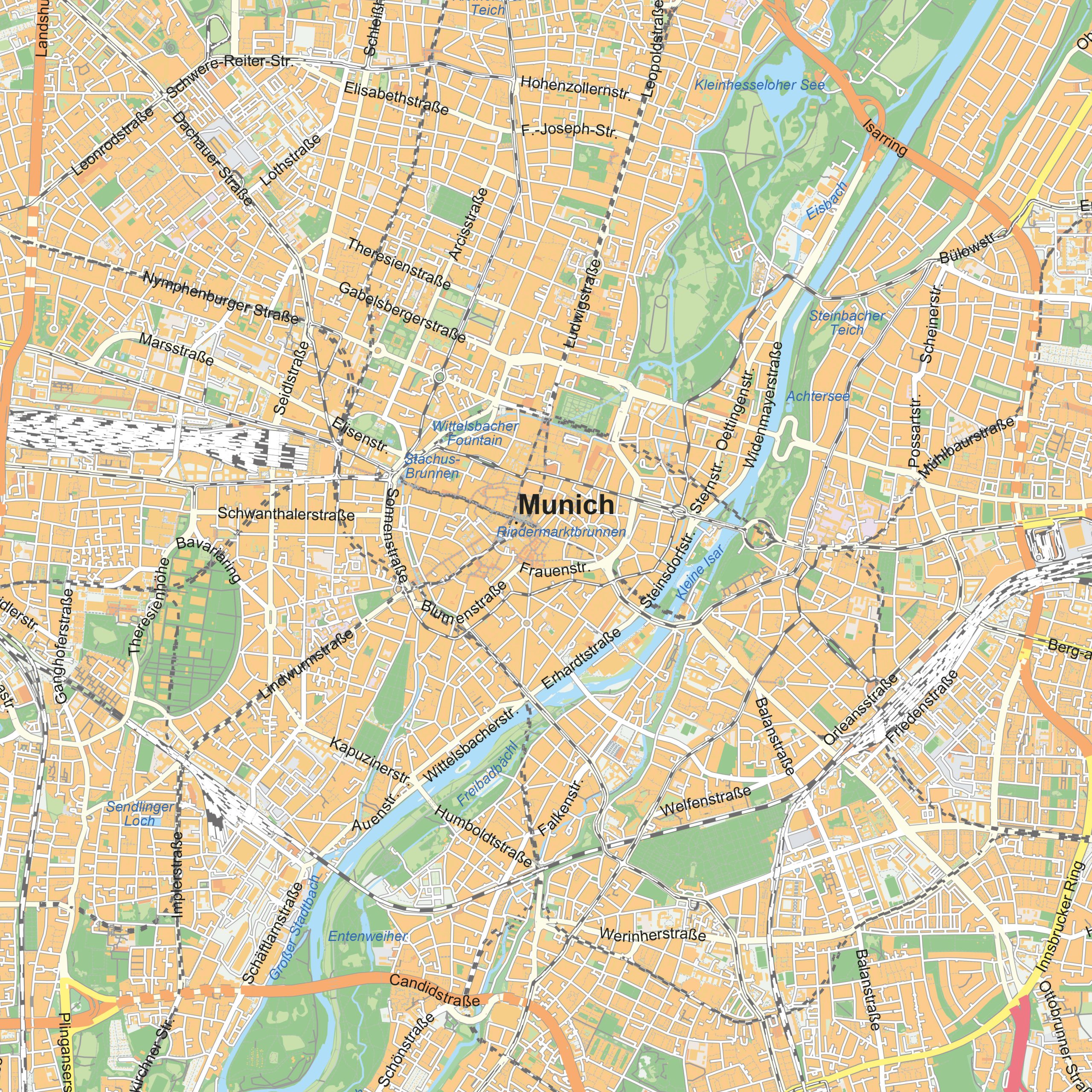 This detailed city map of Munich presents the Bavarian capital in a clear and well-organised layout. From the historic Altstadt around Marienplatz to neighbourhoods such as Schwabing, Haidhausen and the Glockenbachviertel, the city’s structure is shown in precise detail. Streets, waterways, urban parks and public squares are clearly depicted, creating an accurate overview of Munich’s spatial organisation. The map reflects the city’s layered history, strong urban structure and generous green areas, resulting in a balanced and readable representation of Munich.