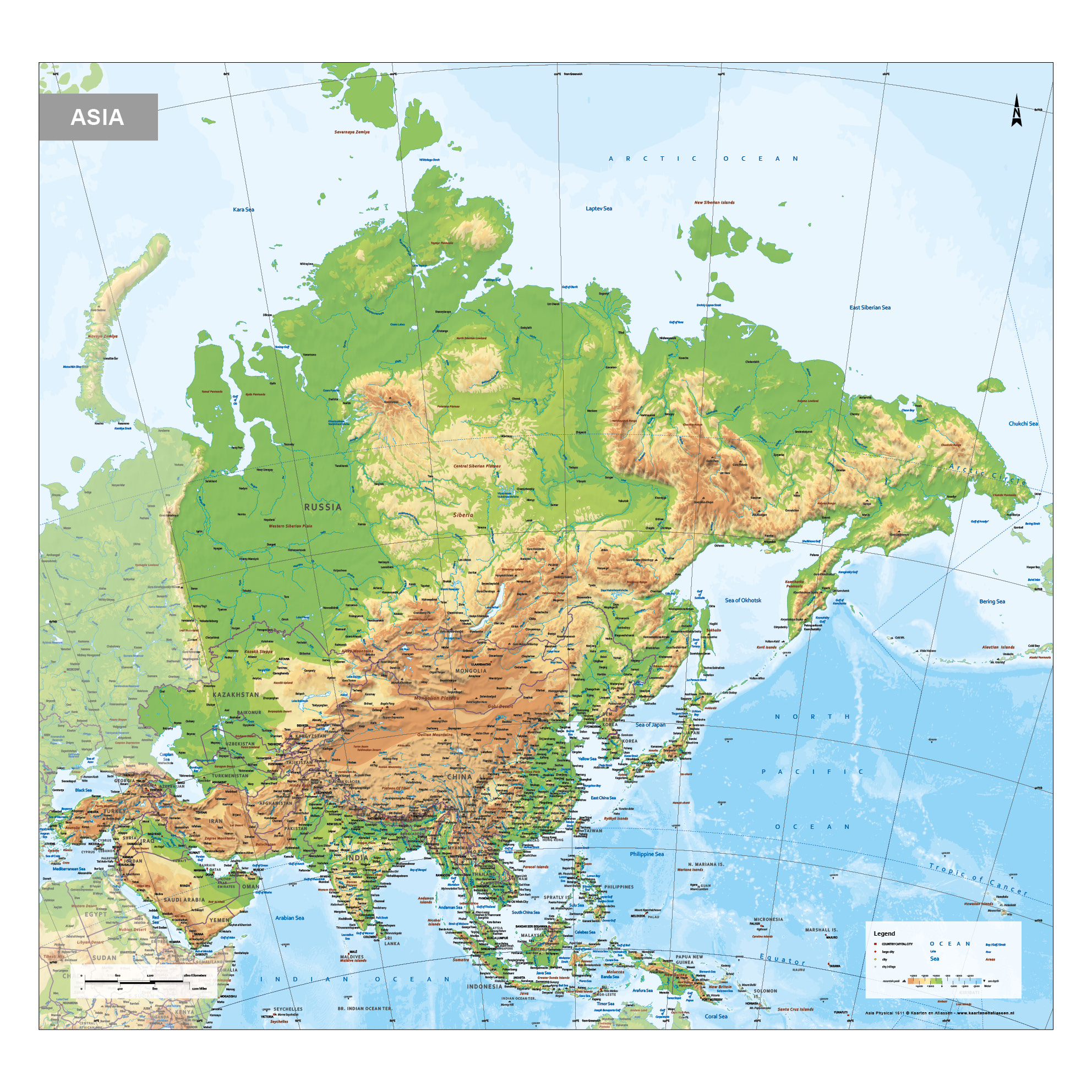 This category features maps covering the entire Asian continent as well as focused regional views, including areas such as Central Asia and Southeast Asia. The selection includes political maps that clearly define countries and borders, alongside physical maps illustrating terrain, relief and natural features.