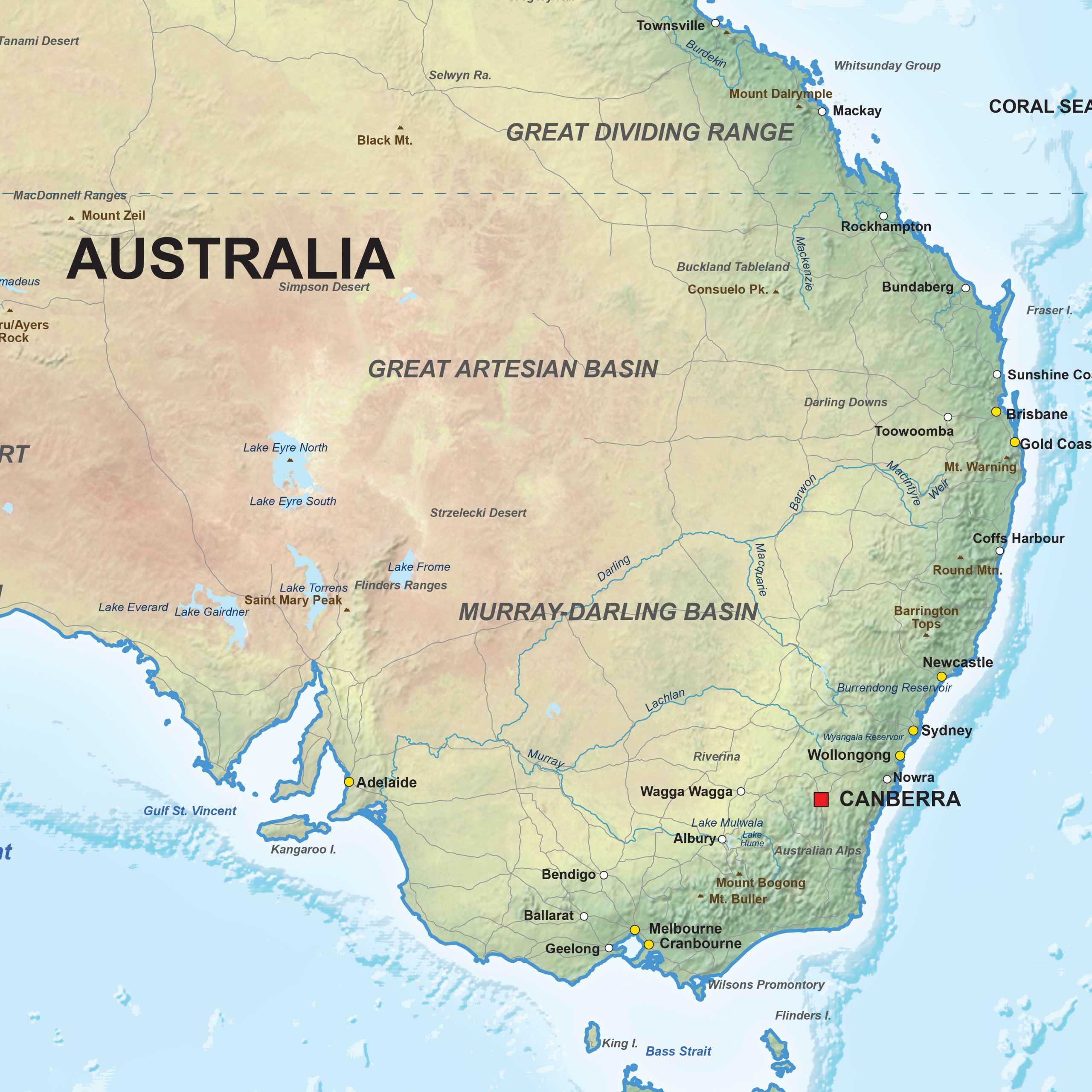 This physical digital vector map of Australia presents a detailed representation of the continent’s natural geography. Relief shading clearly illustrates elevation differences across land areas as well as the surrounding seas, providing insight into terrain and seabed structure. National boundaries are subtly highlighted, supporting geographic orientation without dominating the visual layout. The map includes capitals, major cities, smaller settlements, rivers, water bodies, main road connections and key mountain regions, all arranged in a clear and readable structure. A contemporary colour palette enhances visual clarity while maintaining a calm and professional appearance. Designed as a digital vector map, all elements remain sharp at any scale, making it suitable for design, publishing and informational use.