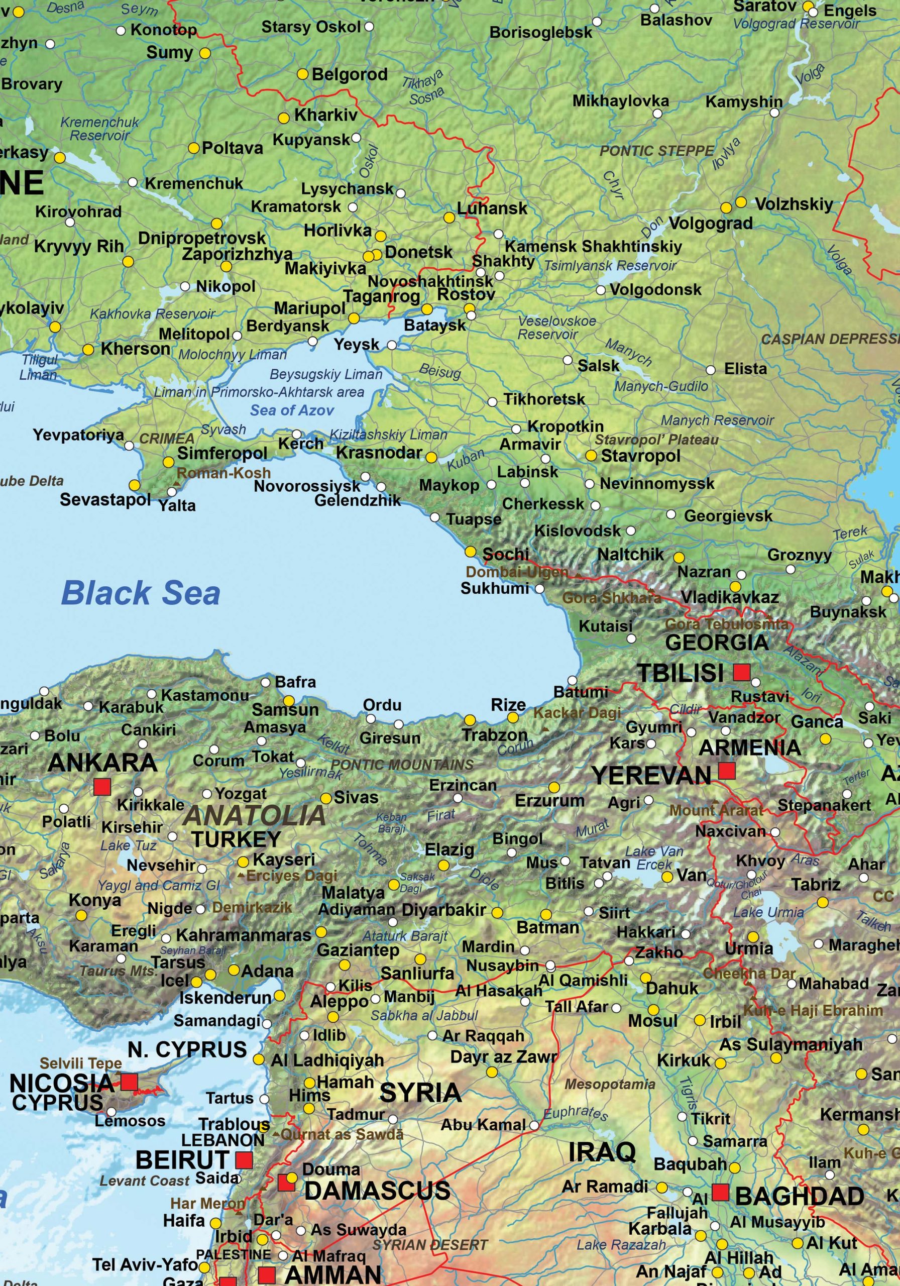 This physical digital vector map presents a detailed geographic overview of the Middle East, North Africa and Europe with an emphasis on terrain and relief. Elevation shading highlights mountain ranges, plateaus and lowland areas, providing a clear representation of physical geography across the region. All countries are clearly defined, with capitals and a wide range of major cities included. The map is suited for environments where geographic orientation and regional context are important, supported by a bright and balanced colour palette that enhances readability. Designed as a digital vector map, all elements remain sharp at any scale and suitable for professional visual and informational use.