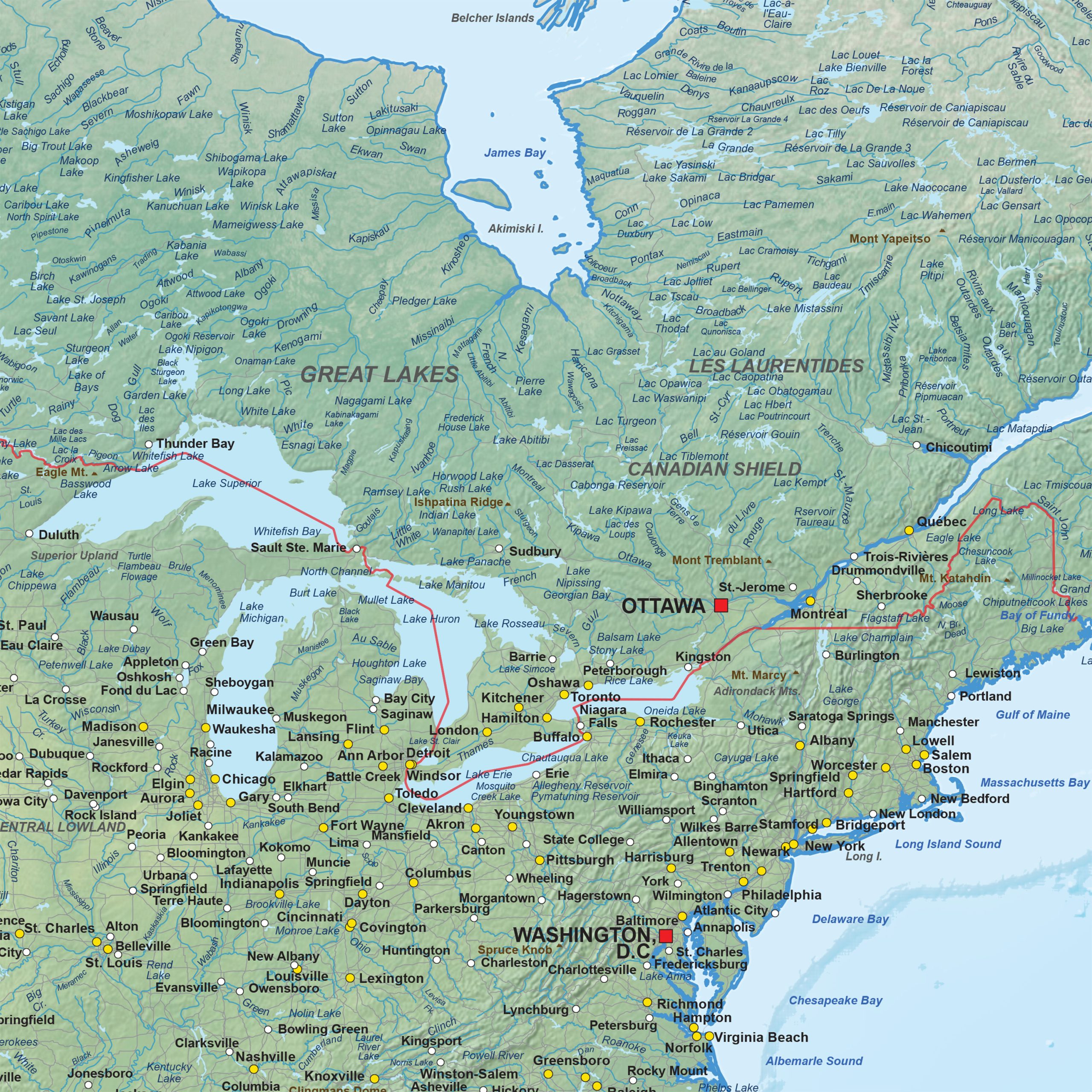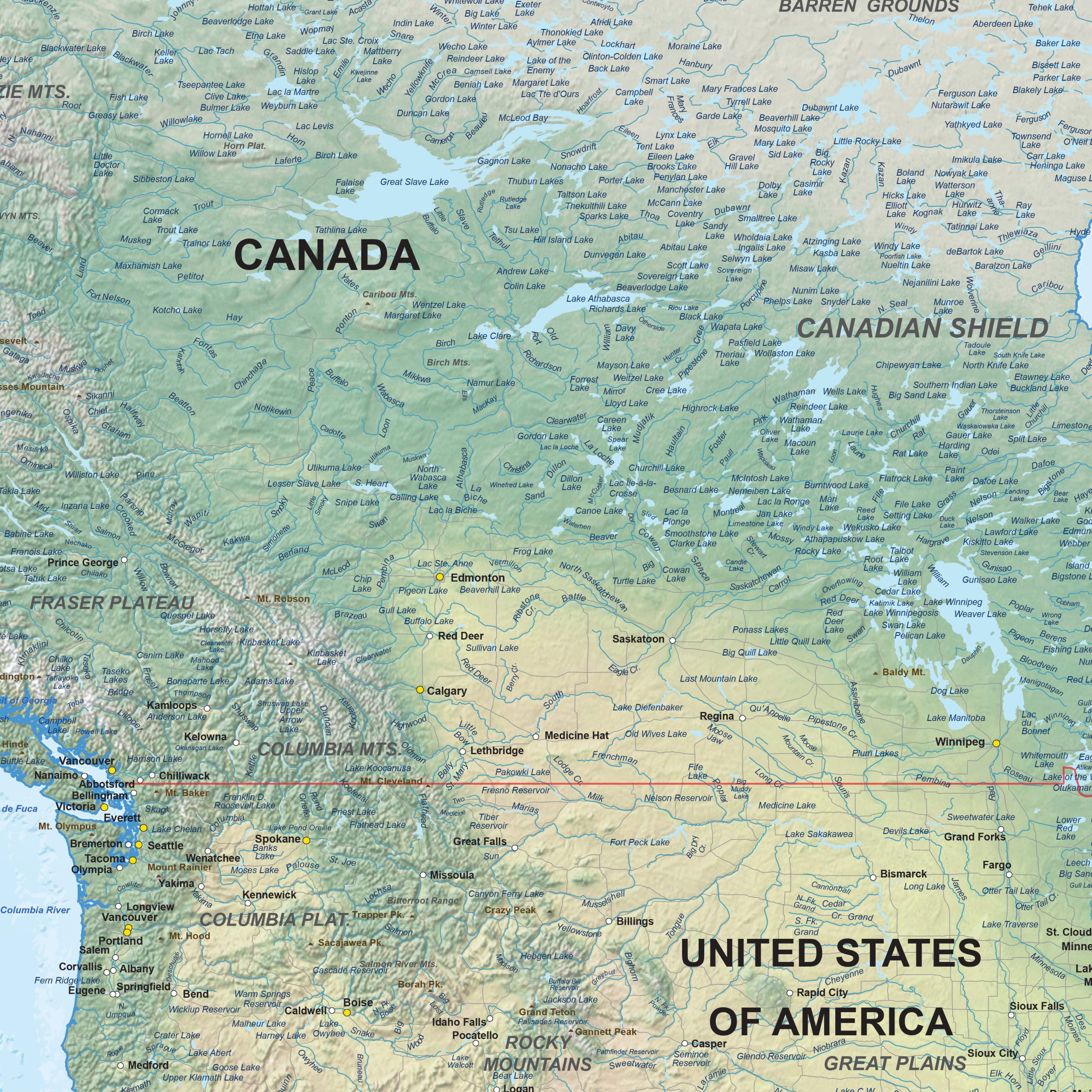 This physical digital vector map of North America displays detailed elevation shading combined with colours that reflect major vegetation patterns across the continent. Countries, capitals, regional cities, rivers, water bodies, main transport corridors and mountain regions are arranged in a clear and well-balanced layout. The relief background highlights landforms such as mountain chains, plateaus and coastal areas, supporting a comprehensive geographic interpretation. Designed as a digital vector map, all elements maintain clarity at any scale and provide a dependable base for design studios, publishers and organisations that require accurate physical geography for visual or educational use.