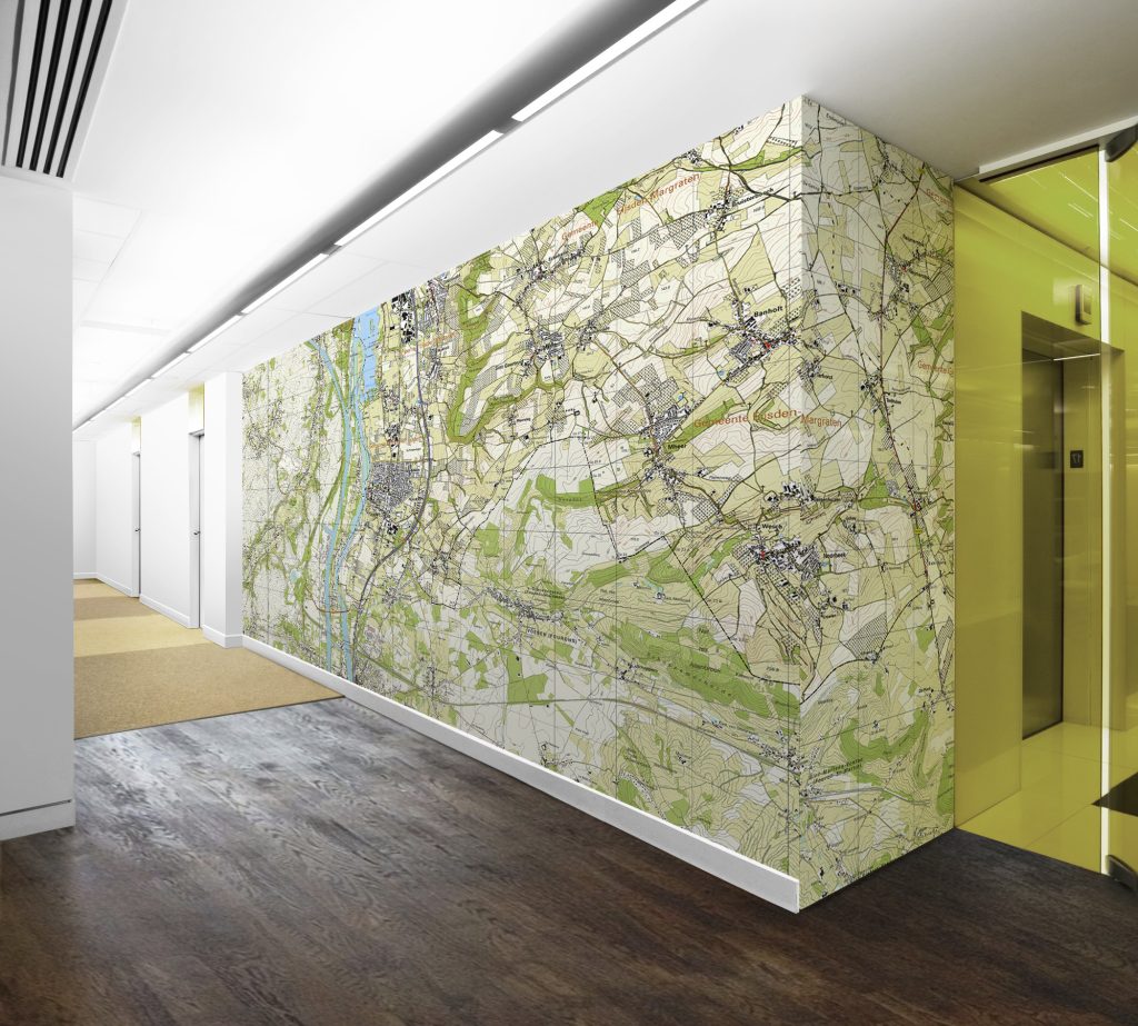 Grotere kaarten kunnen op meerdere panelen worden afgedrukt en tegen elkaar aan op de wand worden gemonteerd.
