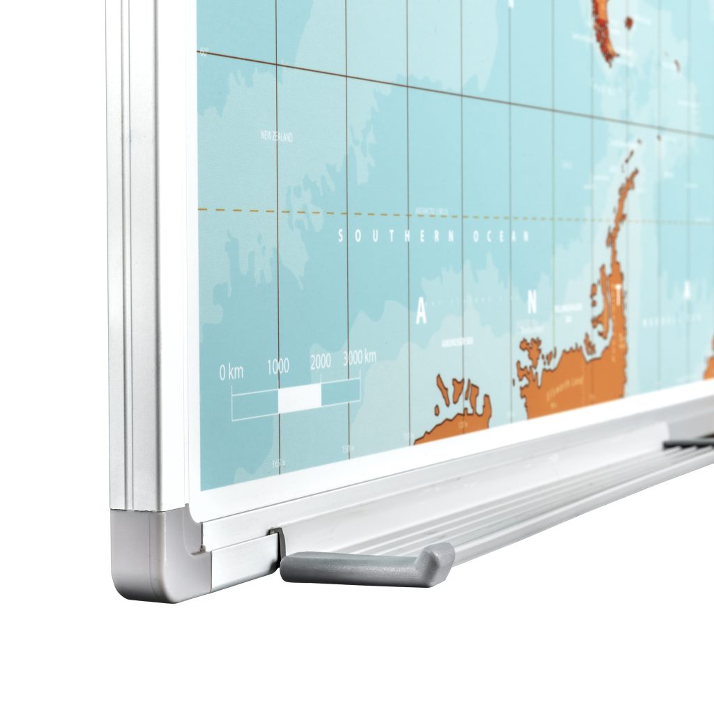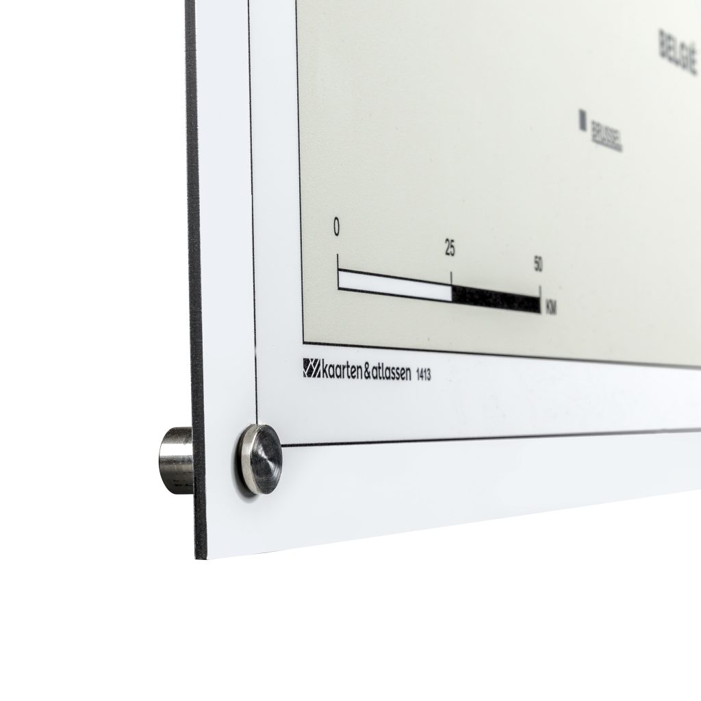 Een whiteboard is magneethoudend, beschrijf- en afwisbaar. Onze whiteboards worden volgens een sublimatieproces gemaakt. Het kaartbeeld wordt met superieure beeldkwaliteit duurzaam in het whiteboardoppervlak geïntegreerd. De afbeelding wordt optimaal beschermd tegen slijtage doordat de print zich niet aan de oppervlakte bevindt. Standaard worden ophangbeugels meegeleverd, samen met een handig opbergbakje dat onderaan het whiteboard wordt bevestigd.