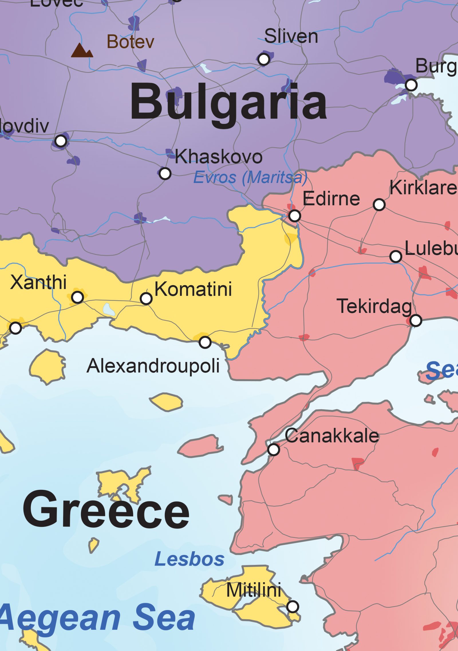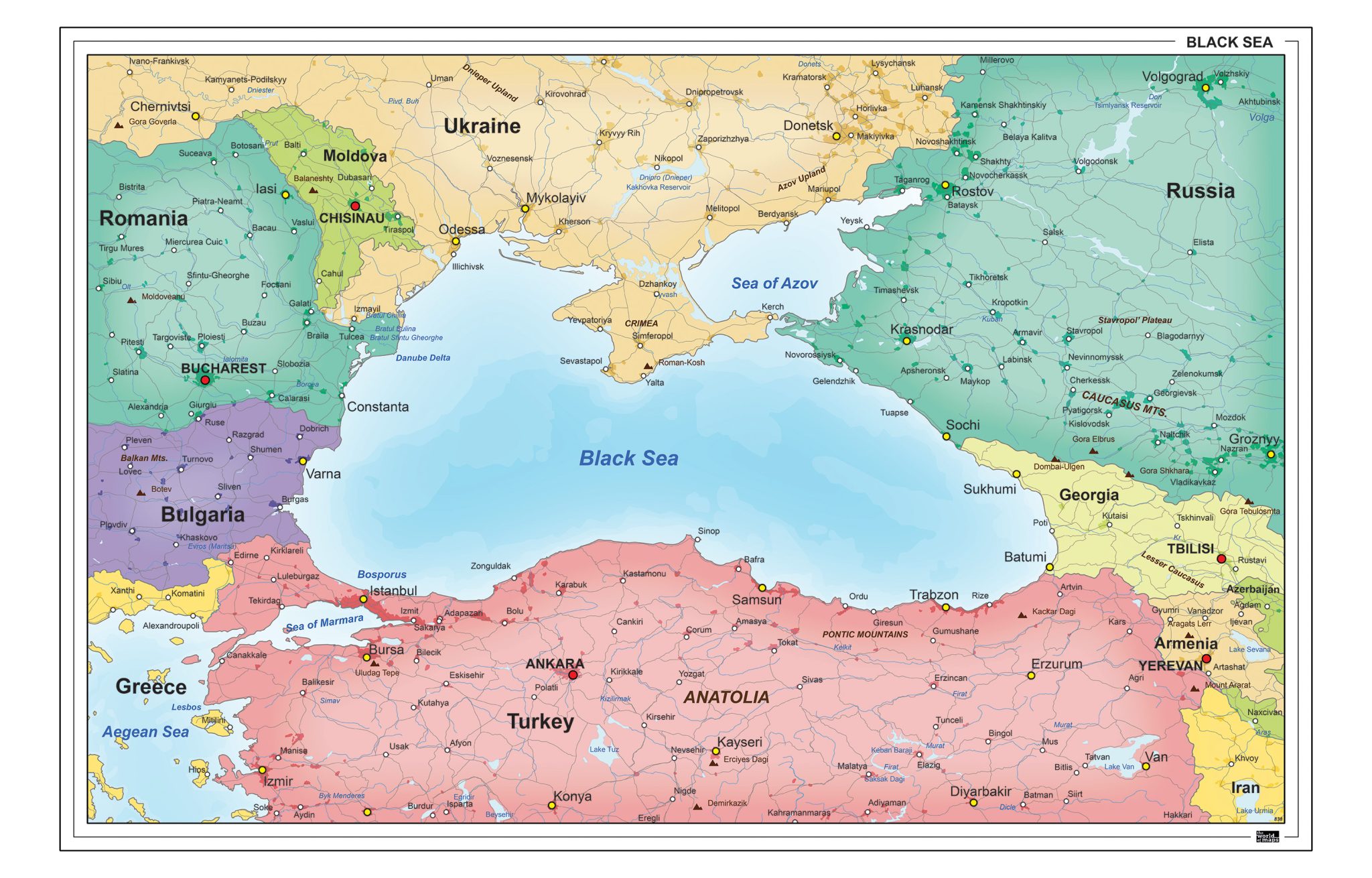 This political digital vector map presents the Black Sea at the centre of a detailed regional overview, surrounded by all bordering countries. National boundaries are clearly defined, while capitals and a wide range of large and smaller cities provide strong geographic context. Roads, waterways and urbanised areas are arranged in a structured and readable layout. Depth variations within the Black Sea are shown using subtle colour transitions, adding physical detail without compromising clarity. Designed as a digital vector map, all elements remain sharp and consistent at any scale, making the map suitable for professional design, publishing and informational applications.