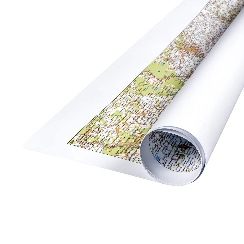 We kunnen de kaart leveren als Vliesbehang, onze standaarduitvoering (matte uitstraling en vlakke structuur). Andere opties zijn: Airtex (matte uitstraling), Airtex PVC vrij (matte uitstraling en fijne structuur) of Vinylbehang (fijne structuur). Het behang kan op rol geleverd worden, maar ook uit één stuk. Alle behangsoorten worden niet meer ingesmeerd met behangerslijm.