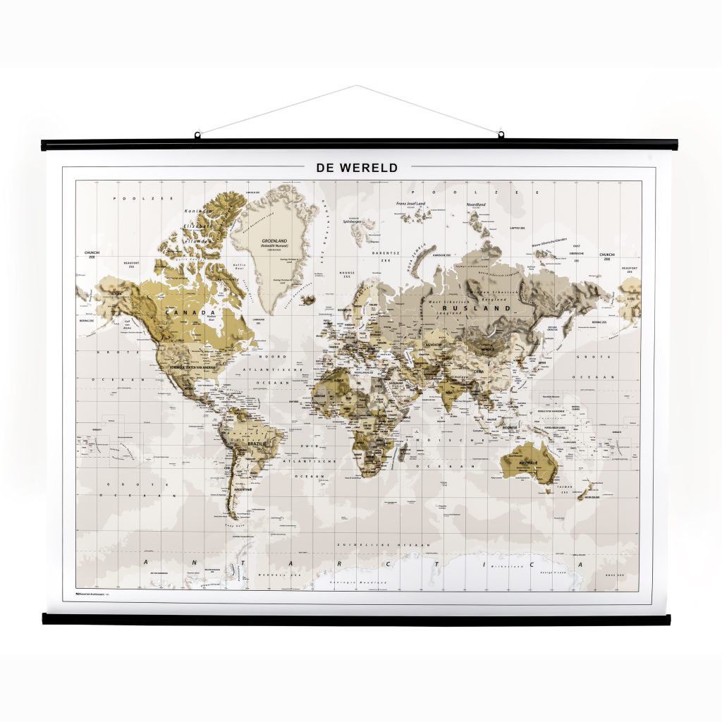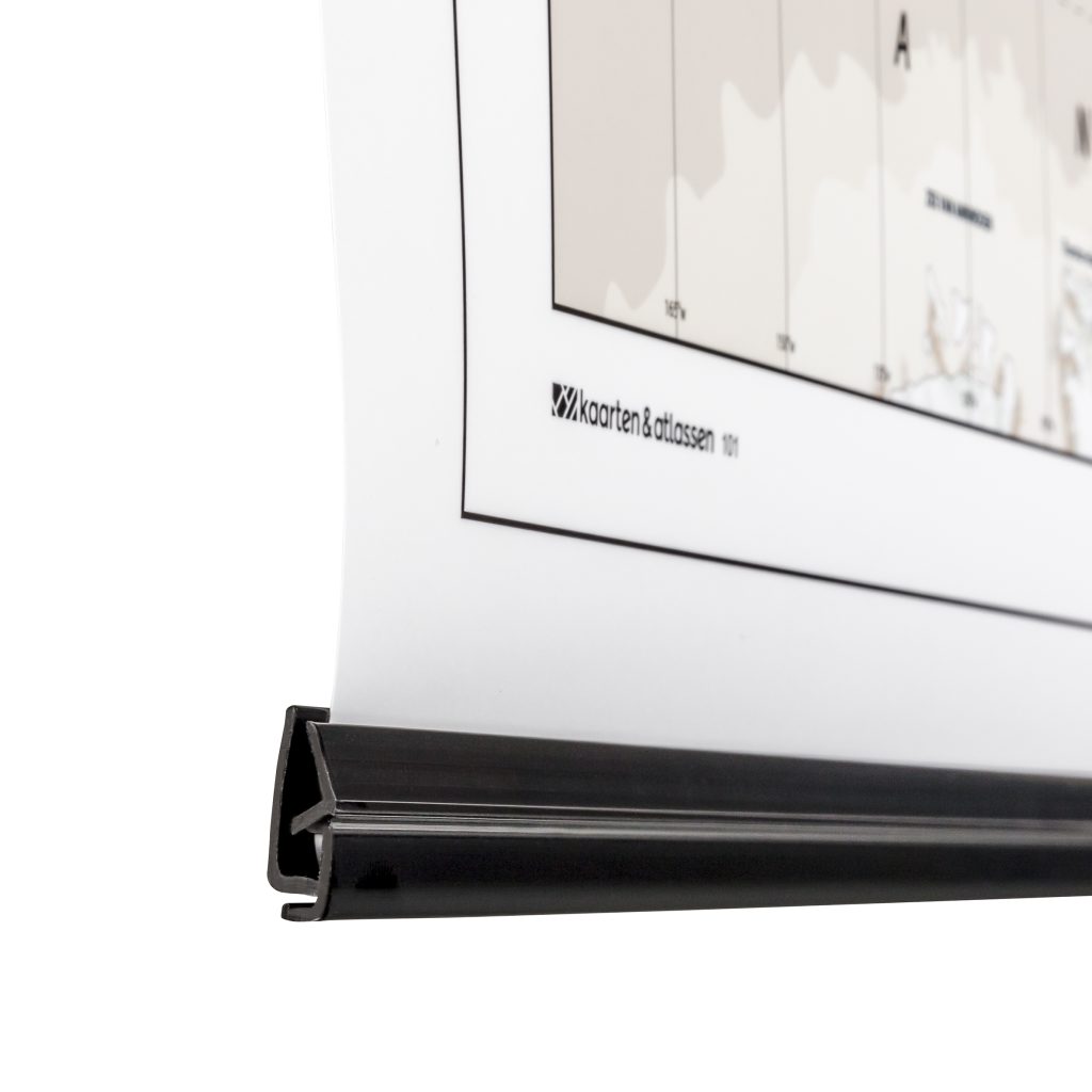 Geschikt voor grotere formaten en kaarten voor intensief gebruik. Schoolkaarten worden door ons op PVC Bisonyl materiaal gedrukt, de meer gangbare naam hiervoor is vrachtwagenzeil. Een dik, glad kunststofmateriaal dat zeer goed te bedrukken is en ook bijna onverwoestbaar is. Een passend ophangsysteem bij dit materiaal zijn de houten stokken. Deze zijn rond met een doorsnede van 2,5cm. Aan de bovenste stok wordt een wit koord aangebracht.