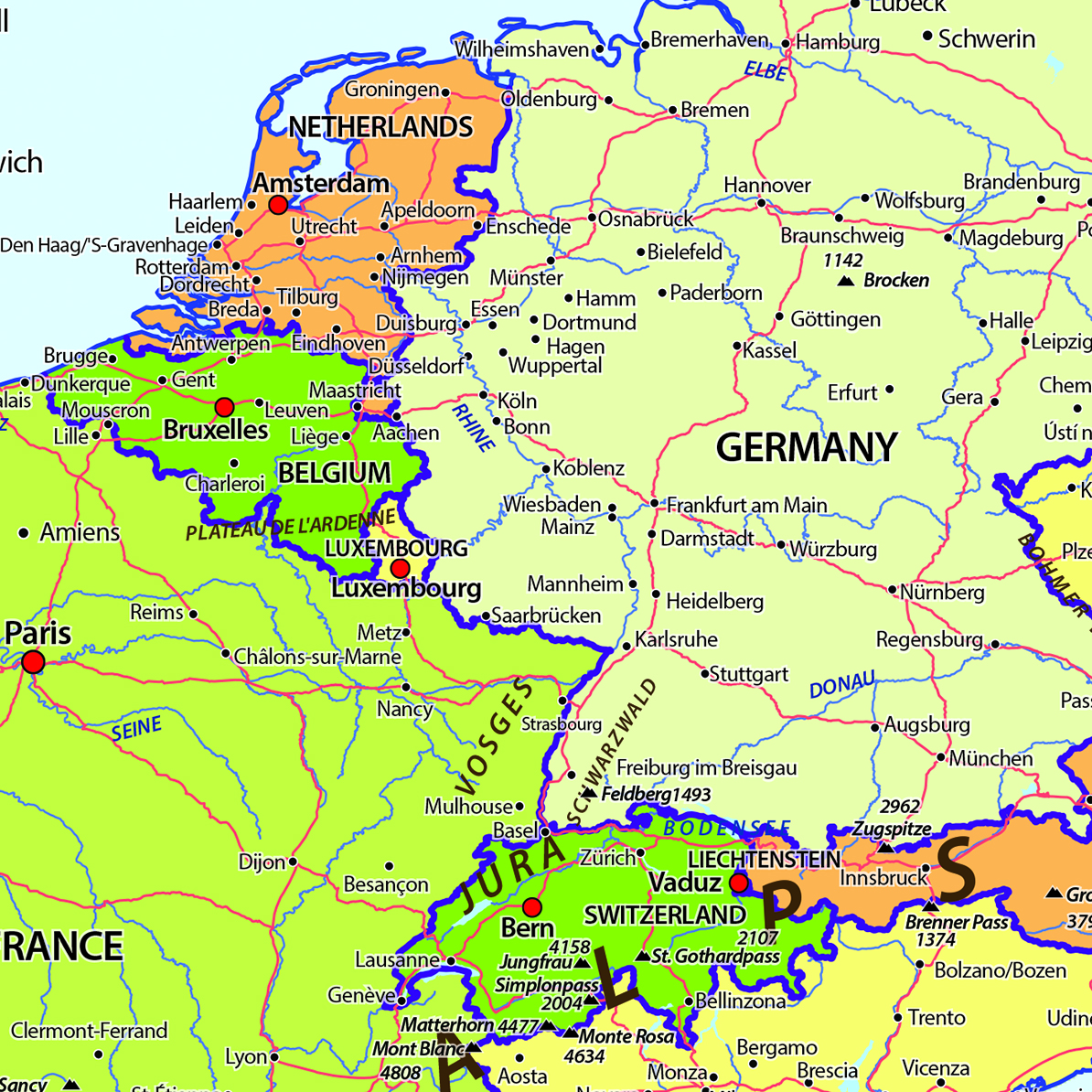 This detailed digital vector map presents Europe, the Middle East and Africa within a single, coherent geographic overview. All countries are clearly defined, while capitals, major cities and key road connections are shown in a structured and readable layout. Country names are intentionally kept smaller, placing visual emphasis on place names and urban locations. This design choice enhances readability where detailed settlement information is required. The map combines clarity with a high level of geographic detail, making it suitable for professional use in design, publishing and informational contexts. As a digital vector map, all elements remain sharp and consistent at any scale.