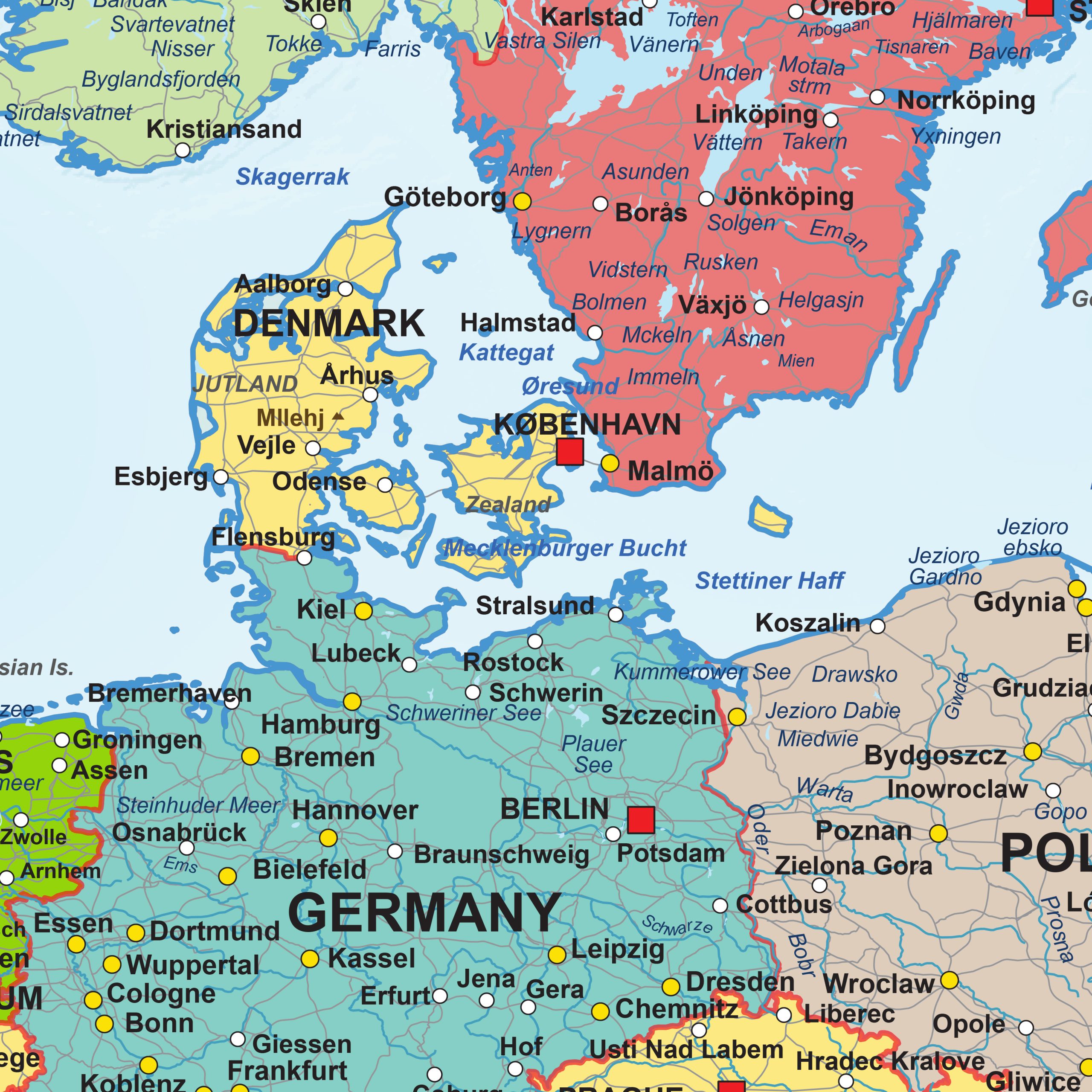 This political digital vector map of Europe offers a detailed and structured overview of the continent. Countries are shown in distinct colours, providing a clear visual separation of administrative boundaries. Capitals, major cities, smaller towns, rivers, water bodies, mountain regions and primary road connections are arranged in a balanced and readable layout. The contemporary colour palette gives the map a modern appearance while maintaining geographic clarity. Designed as a digital vector map, all elements remain sharp at any scale, making it a dependable choice for design studios, publishers and organisations requiring precise political and geographic information.