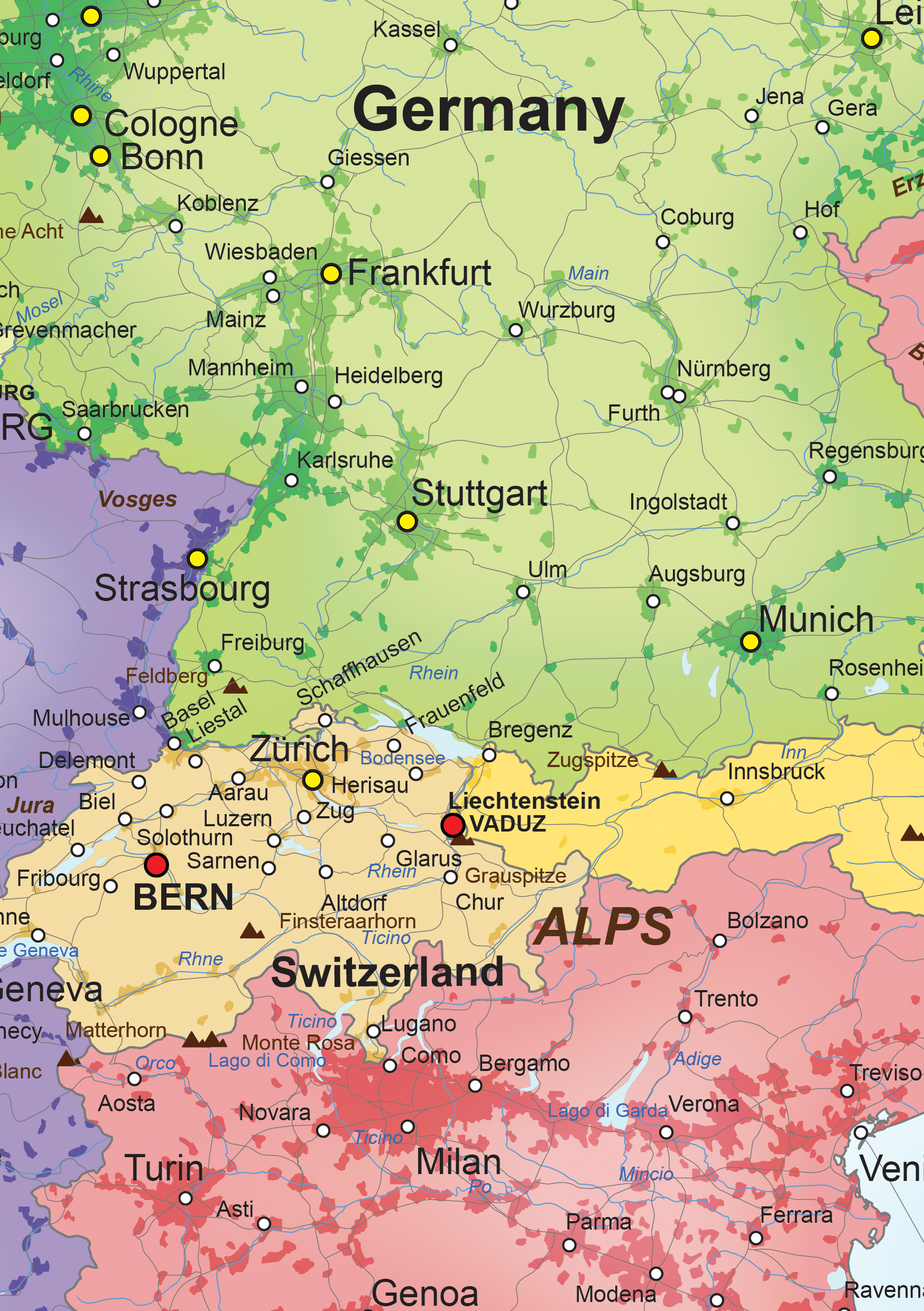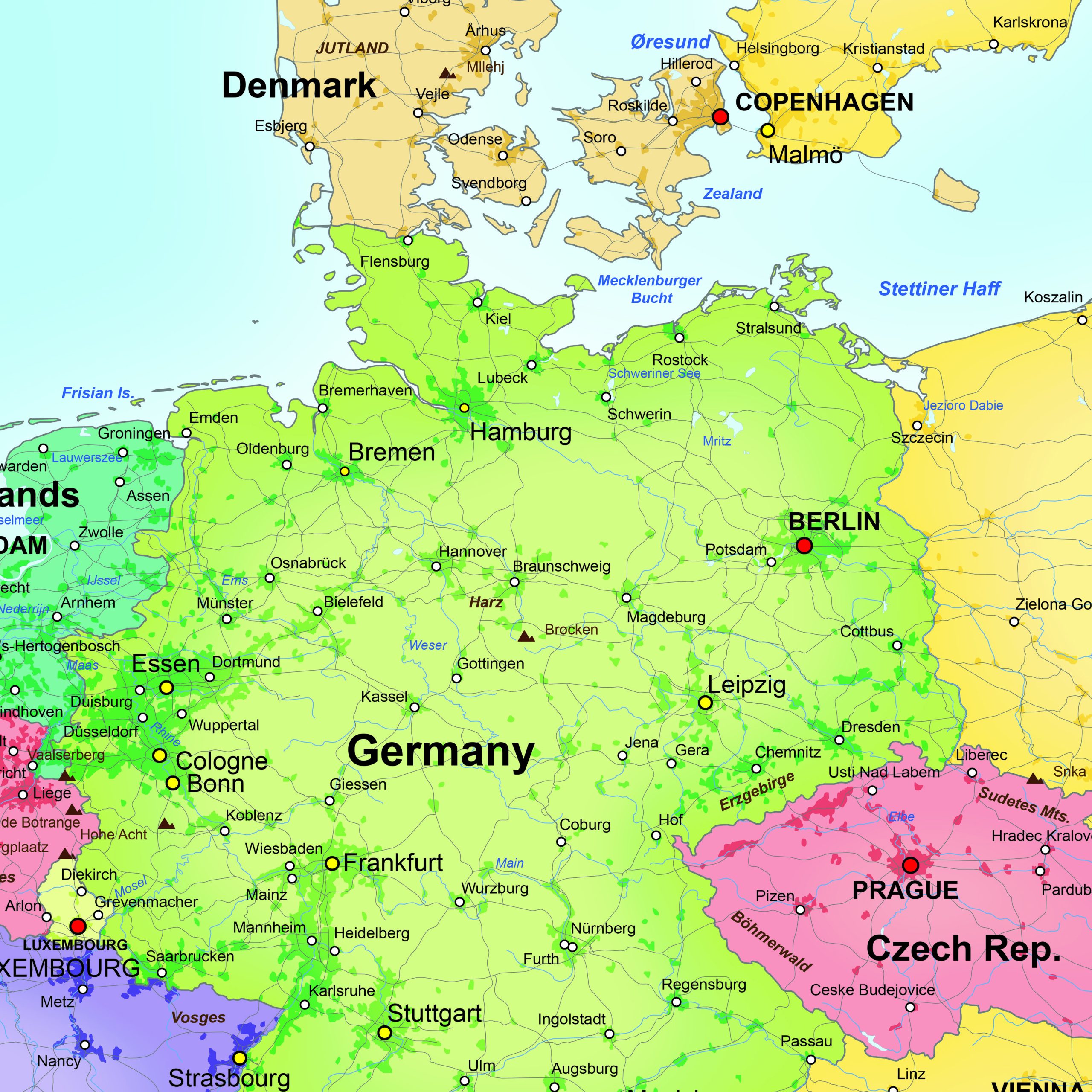 This political digital vector map of Europe is designed in soft pastel colours, offering a calm and clear presentation of the continent. All countries are displayed with distinctly marked boundaries, along with capitals, major cities and important regional centres. Urbanised areas appear in slightly darker shades, giving a structured view of population density. Major highways, railway lines, rivers and coastlines are included in a balanced layout. The map also covers the northern part of North Africa, providing additional geographic context. As a digital vector map, all elements remain sharp and scalable, making it suitable for design, publishing and professional geographic applications.