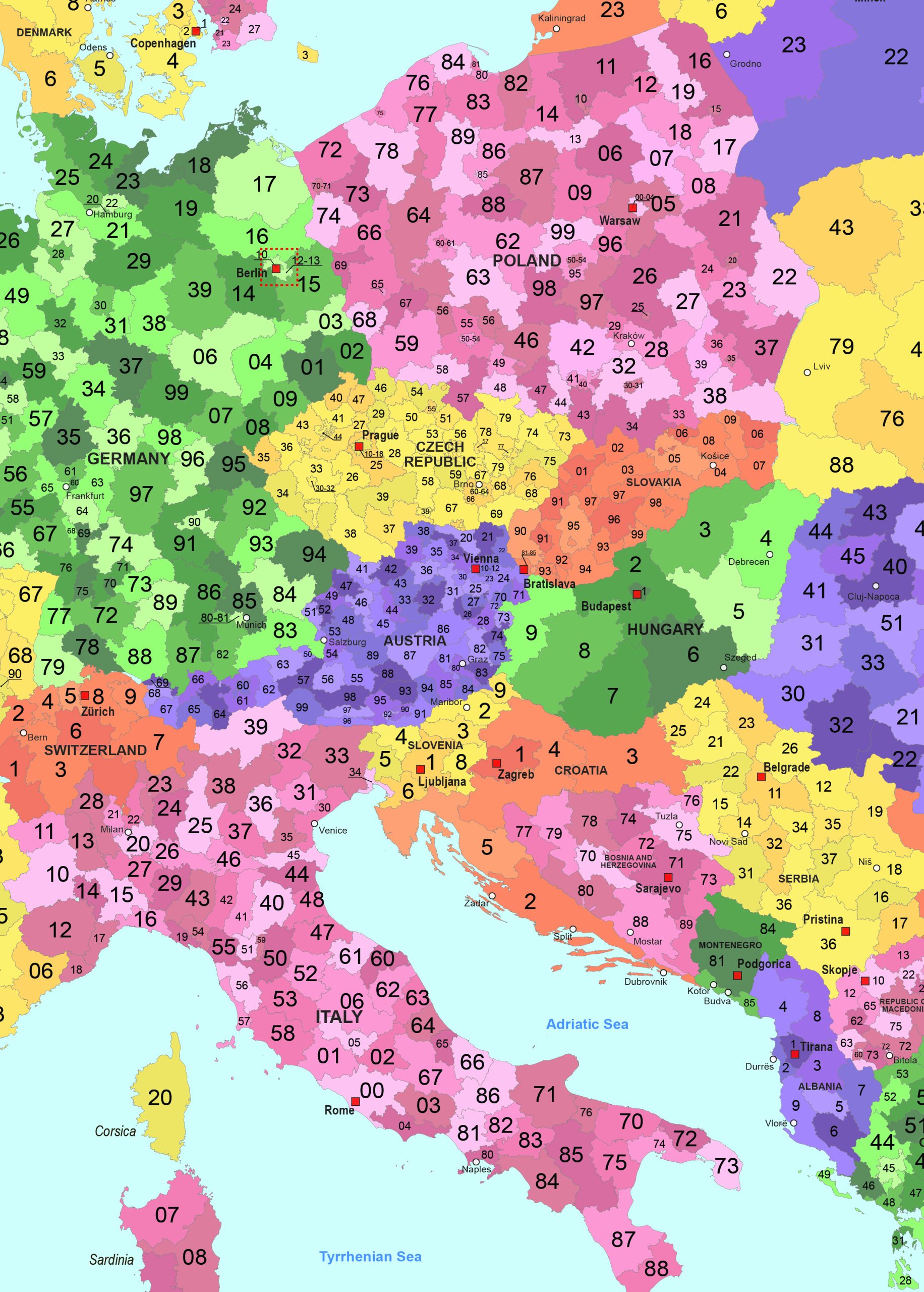 This digital vector map of Europe presents a detailed overview of two-digit postal code regions using a clear, multicolour structure. Each postal area is visually separated through subtle colour variations, allowing boundaries to be easily interpreted at a glance. The map includes inset views of four major European metropolitan areas where postal regions are more complex to display within the main map. This approach creates a complete and well-balanced geographic overview of postal distribution across Europe. Designed for professional use, the map offers clarity, consistency and a structured layout suitable for visual communication, analysis and publishing applications.