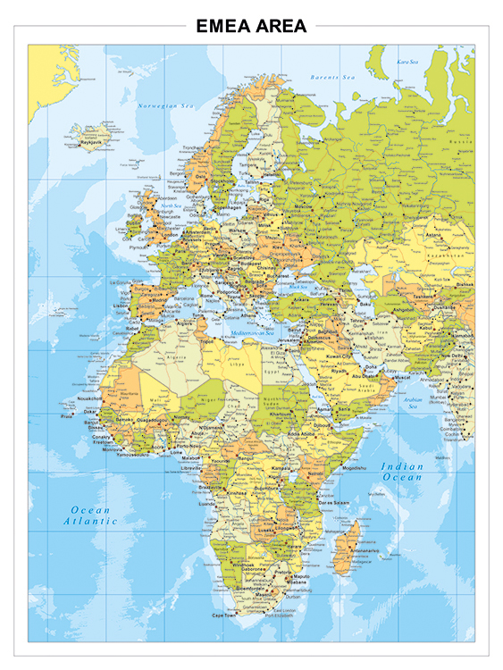 This section features maps that focus on larger regions and subcontinental areas rather than single continents. Examples include EMEA (Europe, the Middle East and Africa), the Benelux combined with Germany, and regional groupings such as countries around the North Sea or the Black Sea. These maps highlight geographic relationships and spatial connections between neighbouring countries and regions.