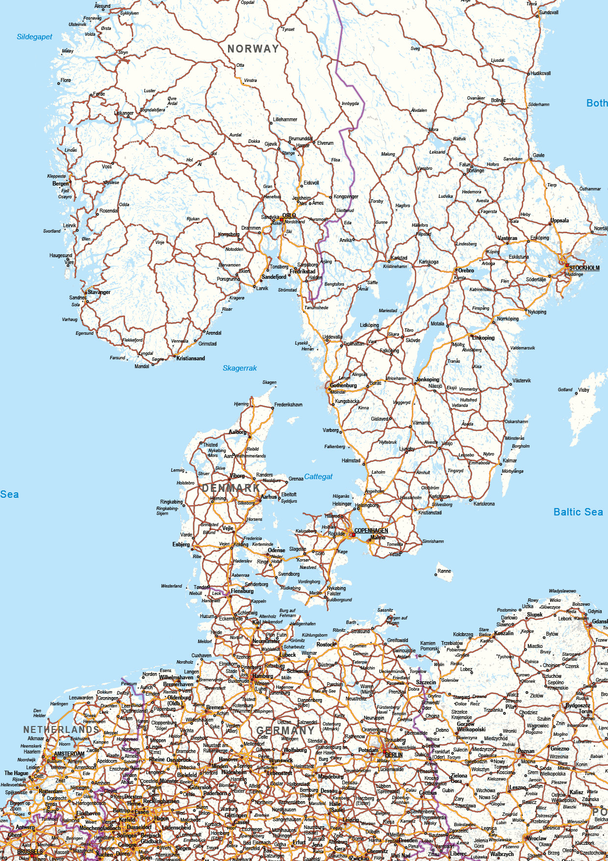 This digital vector map of Europe provides a detailed overview of the continent’s road network, including major highways, motorways and secondary routes. Cities, towns, national borders, rivers and coastlines are displayed in a clear and organised layout that supports professional geographic interpretation. The map combines extensive road information with a balanced visual structure, making it suitable for design studios, publishers and organisations that require reliable transport and boundary data for both print and digital applications. As a digital vector map, all elements remain sharp at any scale.