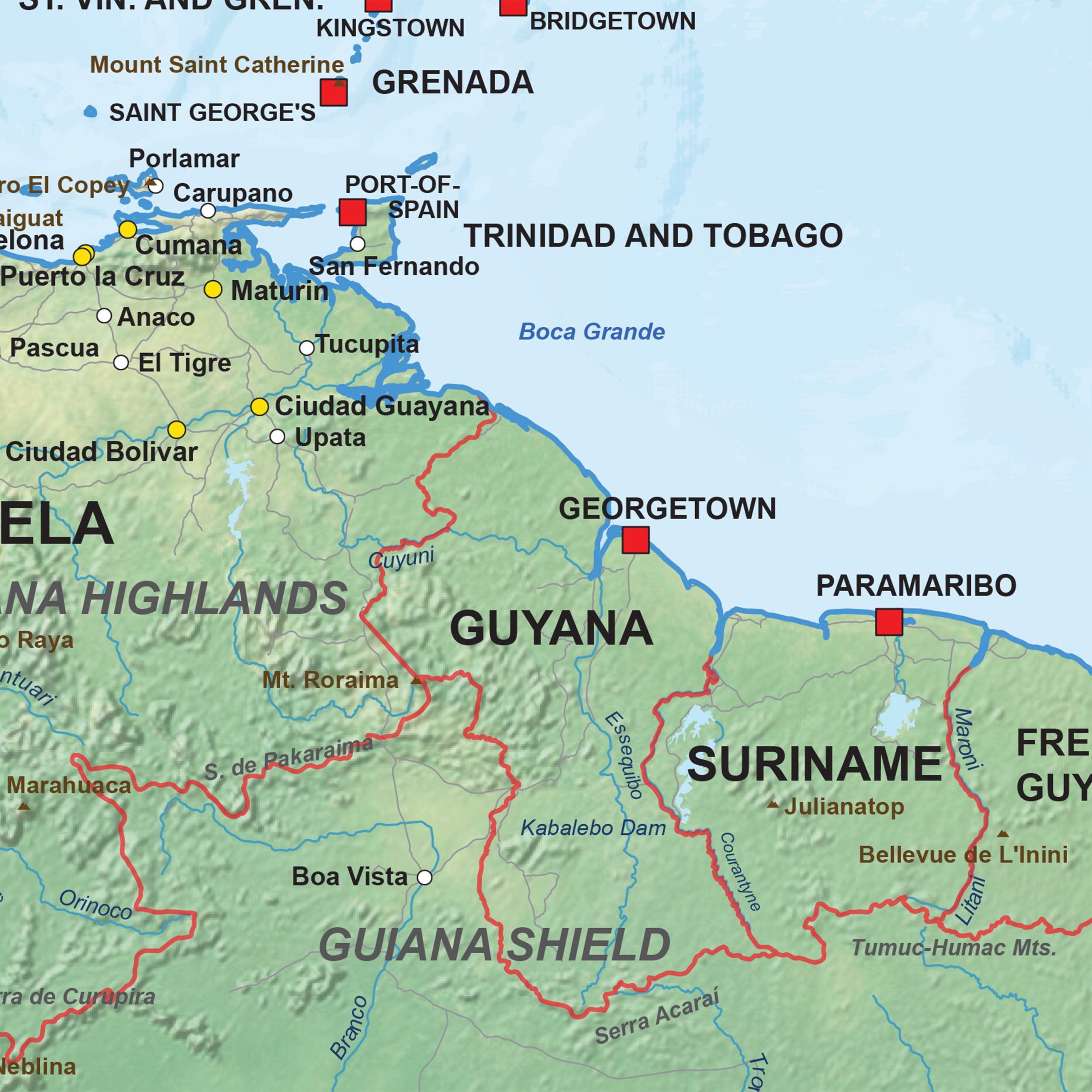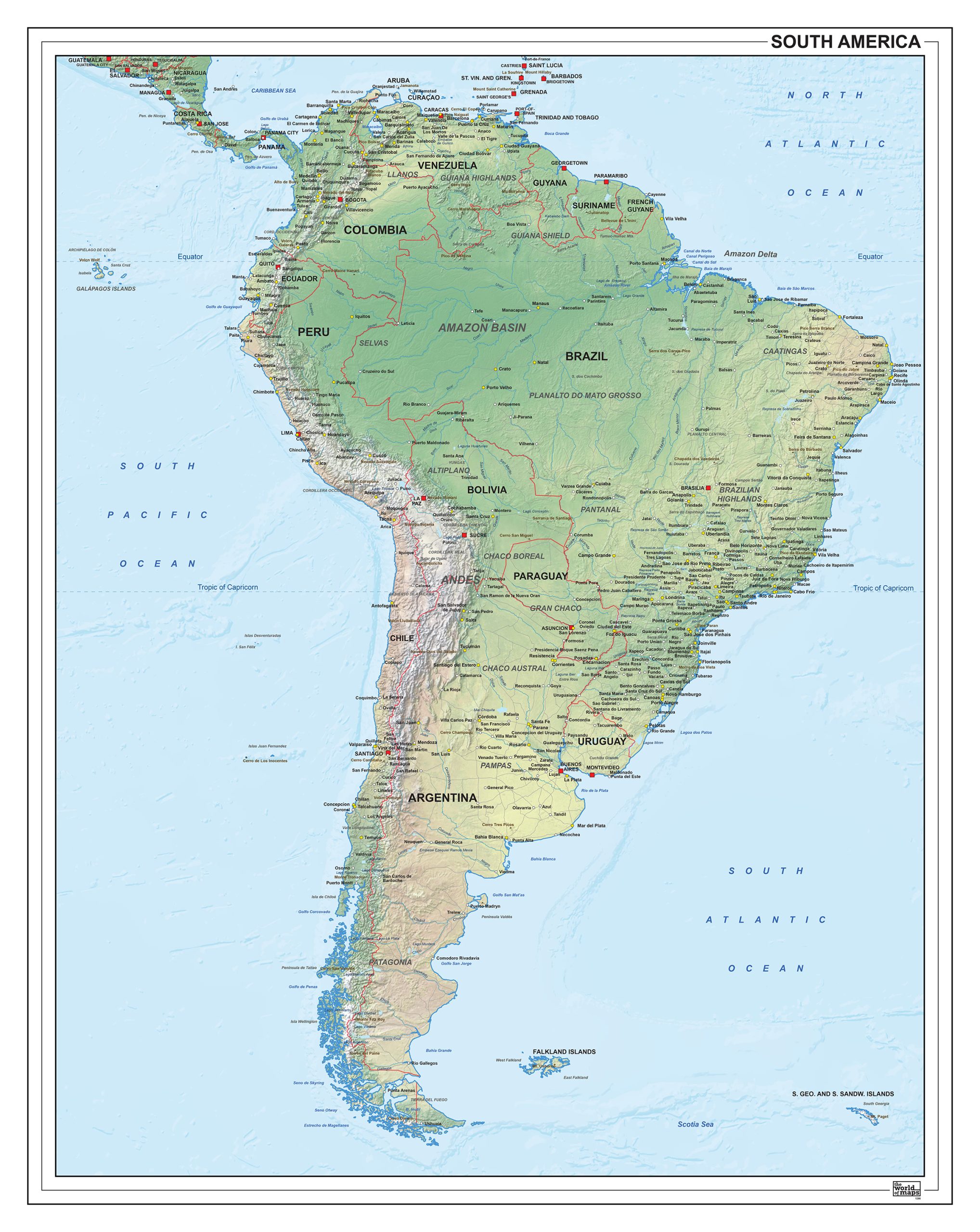 This physical digital vector map of South America shows a detailed relief background combined with a clear representation of major natural features. The Equator and Tropic of Capricorn are included as reference lines, supporting a structured understanding of the continent’s geographic position. Deserts, mountain ranges, river systems, coastal zones and other natural characteristics are presented in an organised layout. Countries, capitals, regional cities, rivers, water bodies, main road networks and mountain areas are clearly displayed. As a digital vector map, all elements remain sharp at any scale and offer a dependable geographic foundation for professional design, publishing and educational applications.