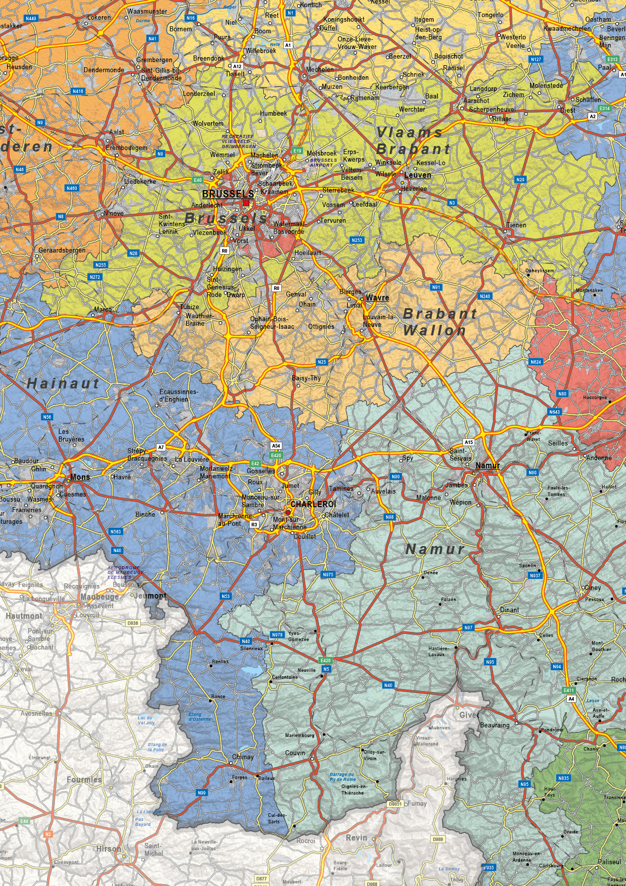 This political map of Belgium provides a detailed and structured overview of the country’s administrative geography. It displays a wide range of cities and towns alongside roads, railways and water systems, offering a high level of geographic context. Provincial boundaries are clearly defined through colour use, making regional divisions easy to recognise at a glance. Road numbers are included for major routes, while the overall design remains balanced and readable despite the amount of information shown.