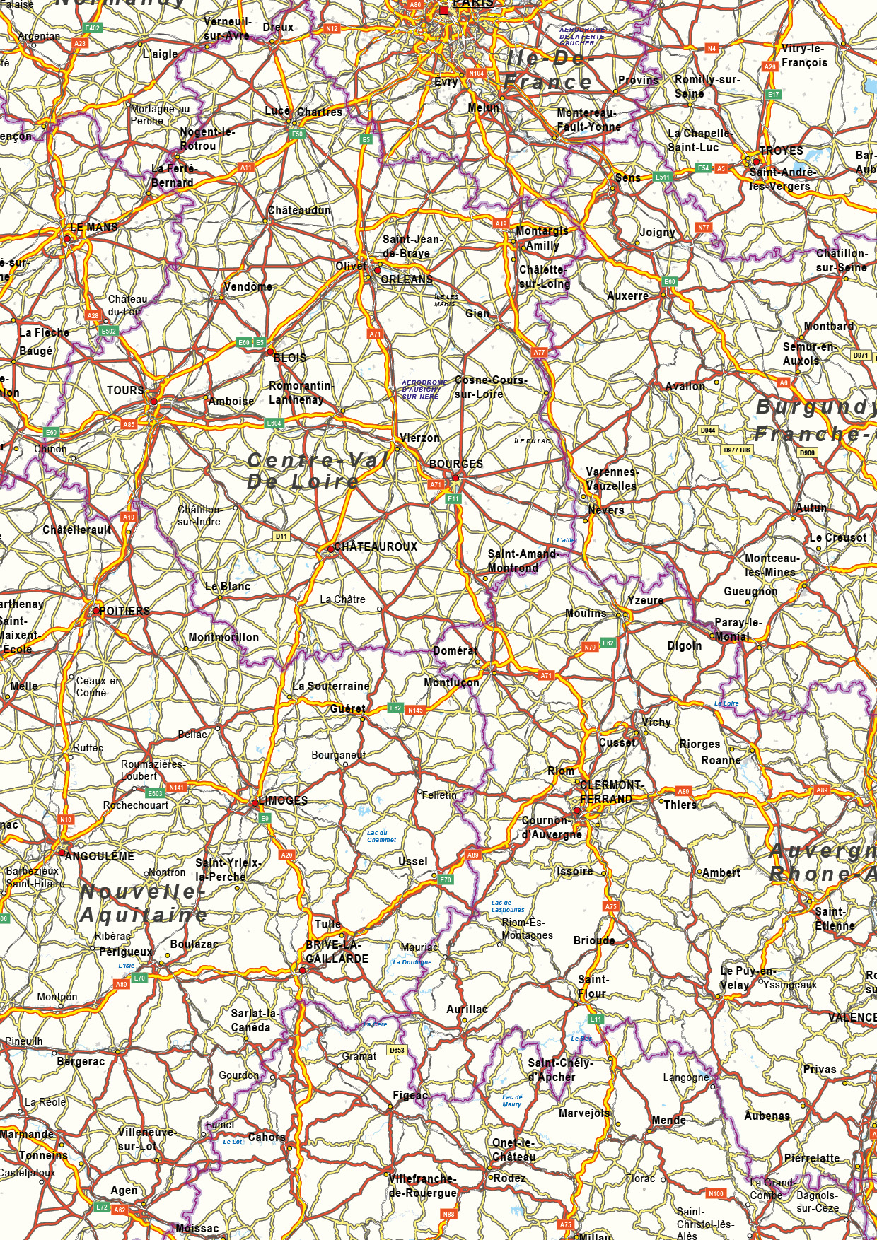 This detailed road digital vector map presents France with a strong emphasis on transport infrastructure and spatial clarity. Cities and towns of various sizes are shown alongside an extensive network of roads, railways and waterways. Major highways and primary routes are clearly indicated with route numbers, supporting navigation and geographic orientation. Provincial boundaries are included to provide administrative context without distracting from the road network. The layered structure ensures that the high level of detail remains readable, making the map suitable for geographic reference, transport analysis and professional visual applications.