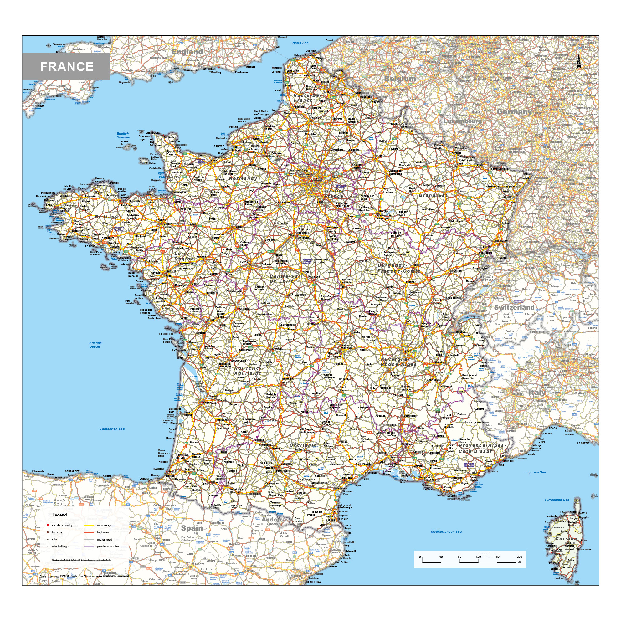 • Detailed road map showing France’s transport network and settlements.