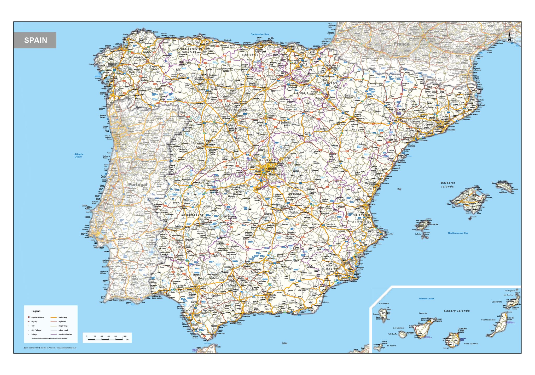 This category includes a broad selection of maps of Spain, featuring political, physical and road map views. Political maps highlight national and regional boundaries, reflecting Spain’s administrative structure. Physical maps focus on terrain and natural features such as mountain ranges, plateaus and river systems. Road maps present the main transport network, including highways and regional routes linking cities and regions across the country.