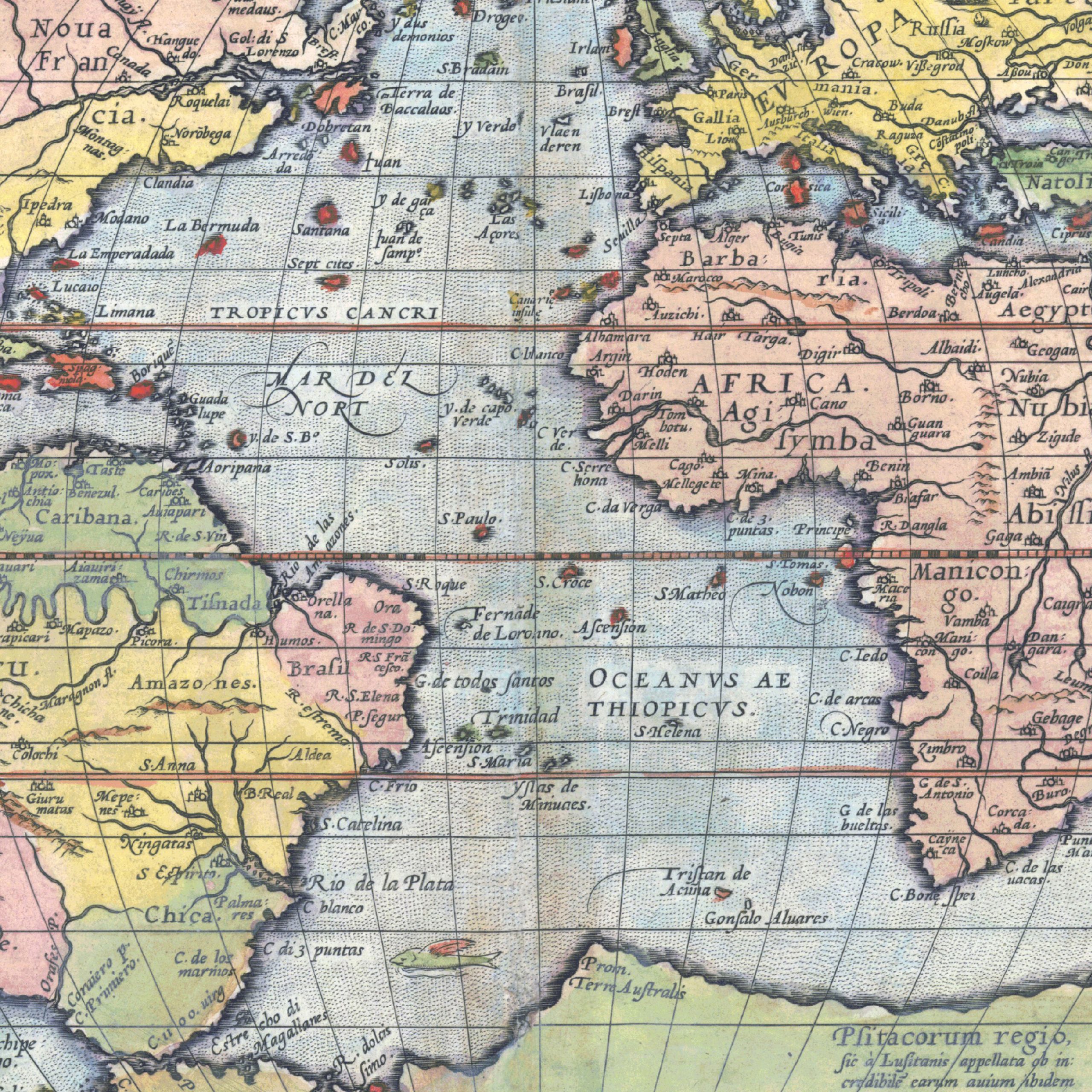 This historical world map is based on the 1570 edition produced by Abraham Ortelius, one of the most influential cartographers of the Renaissance. As part of his groundbreaking atlas Theatrum Orbis Terrarum, this map reflects the geographical understanding of the late 16th century. The design includes Latin text, decorative cloud formations and elegant typographic elements surrounding the central world image. Ortelius combined contemporary geographic knowledge with artistic embellishment, creating a style that shaped European mapmaking for decades. This digital reproduction preserves the vivid colours and characteristic details of the original print, offering insight into early modern views of global geography.