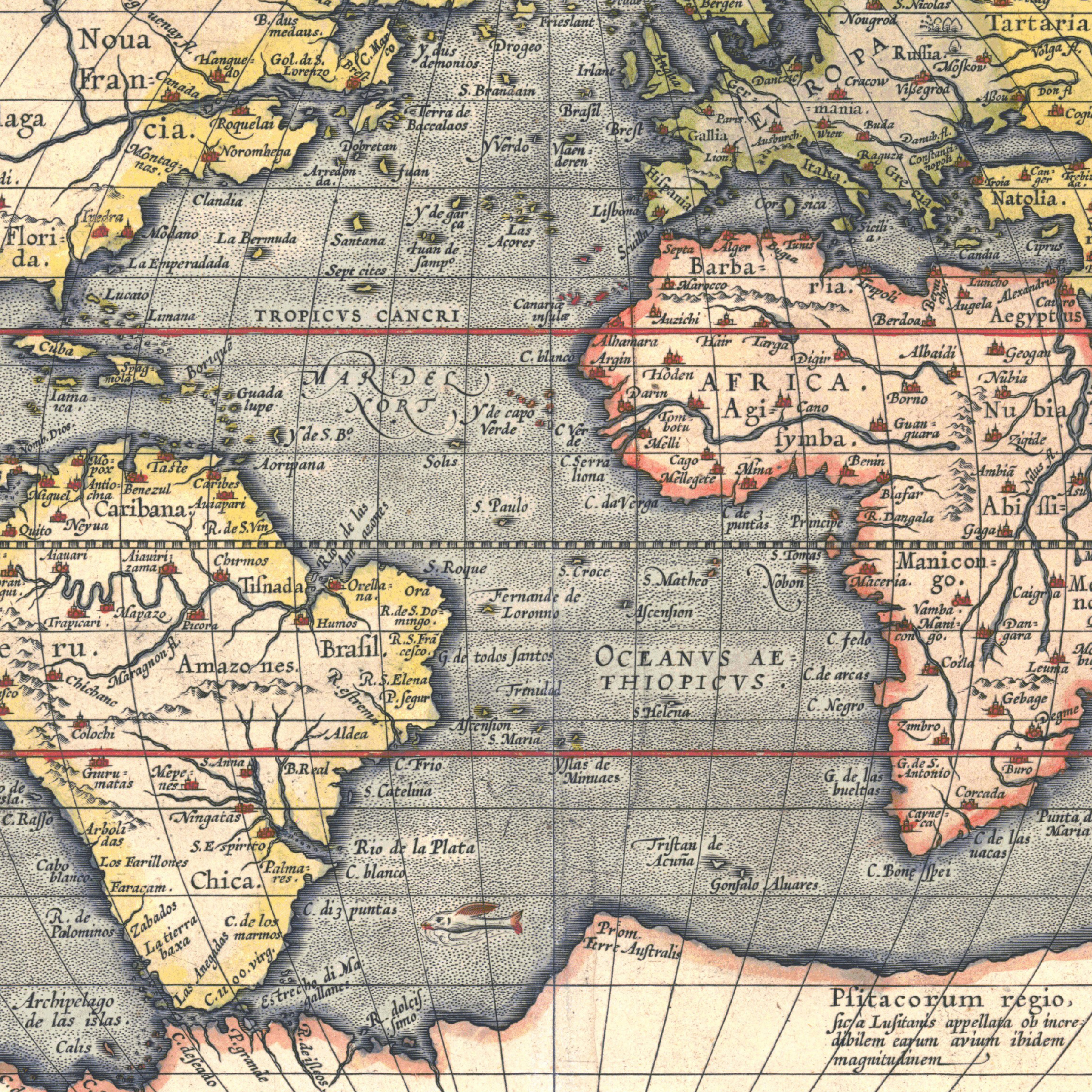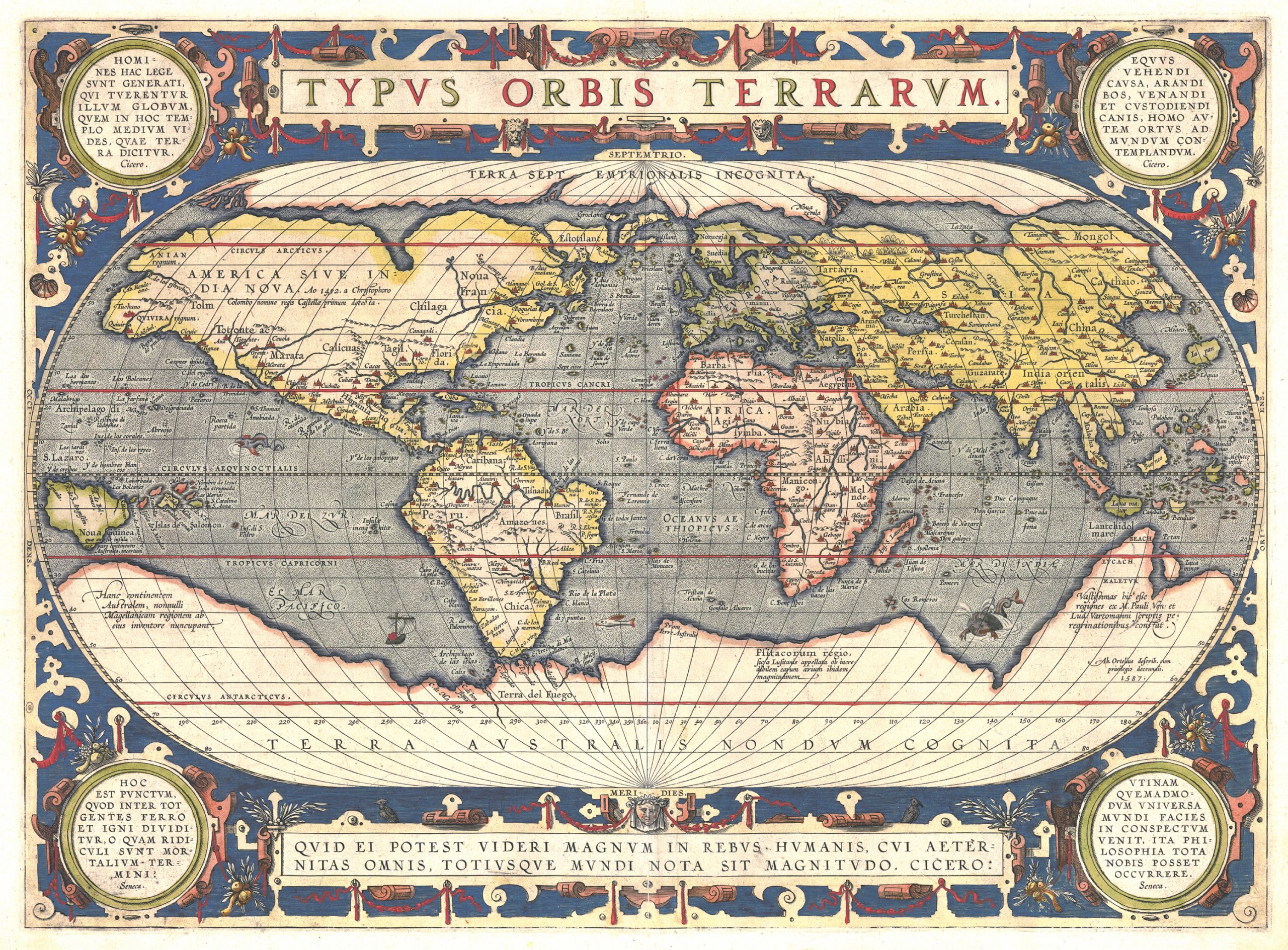 This historical world map is based on the 1592 edition created by Abraham Ortelius, one of the founders of modern atlas cartography. The design reflects Ortelius’s characteristic style, featuring decorative borders, Latin inscriptions and finely engraved geographic details. The map represents the understanding of global geography during the late Renaissance, a period marked by expanding exploration and developing trade routes. Decorative elements, including elaborate frame designs and textual embellishments, highlight the artistic traditions of sixteenth-century mapmaking. This digital reproduction preserves the distinct colour tones, linework and historical character of the original print, offering an authentic glimpse into early modern cartography.