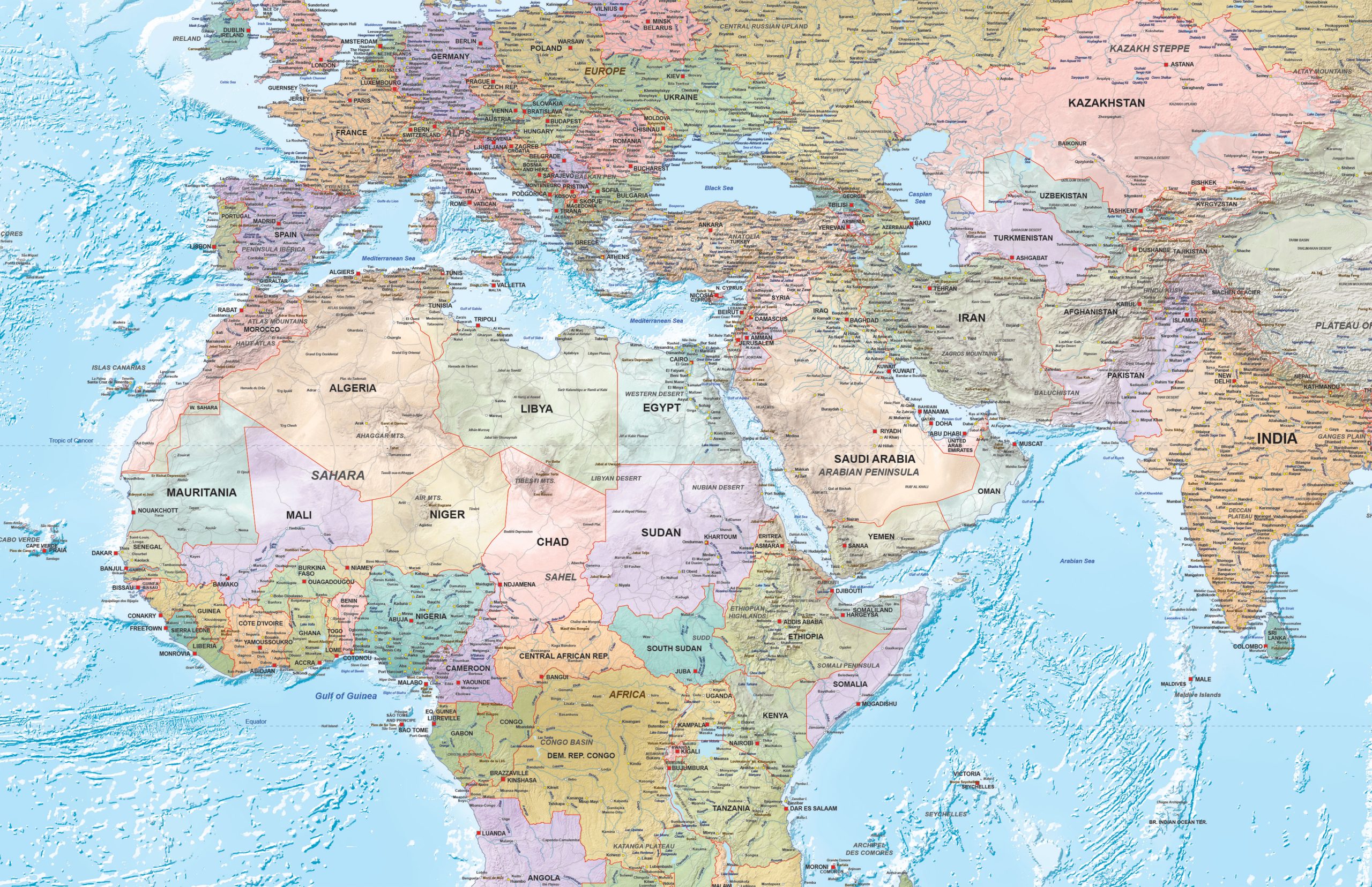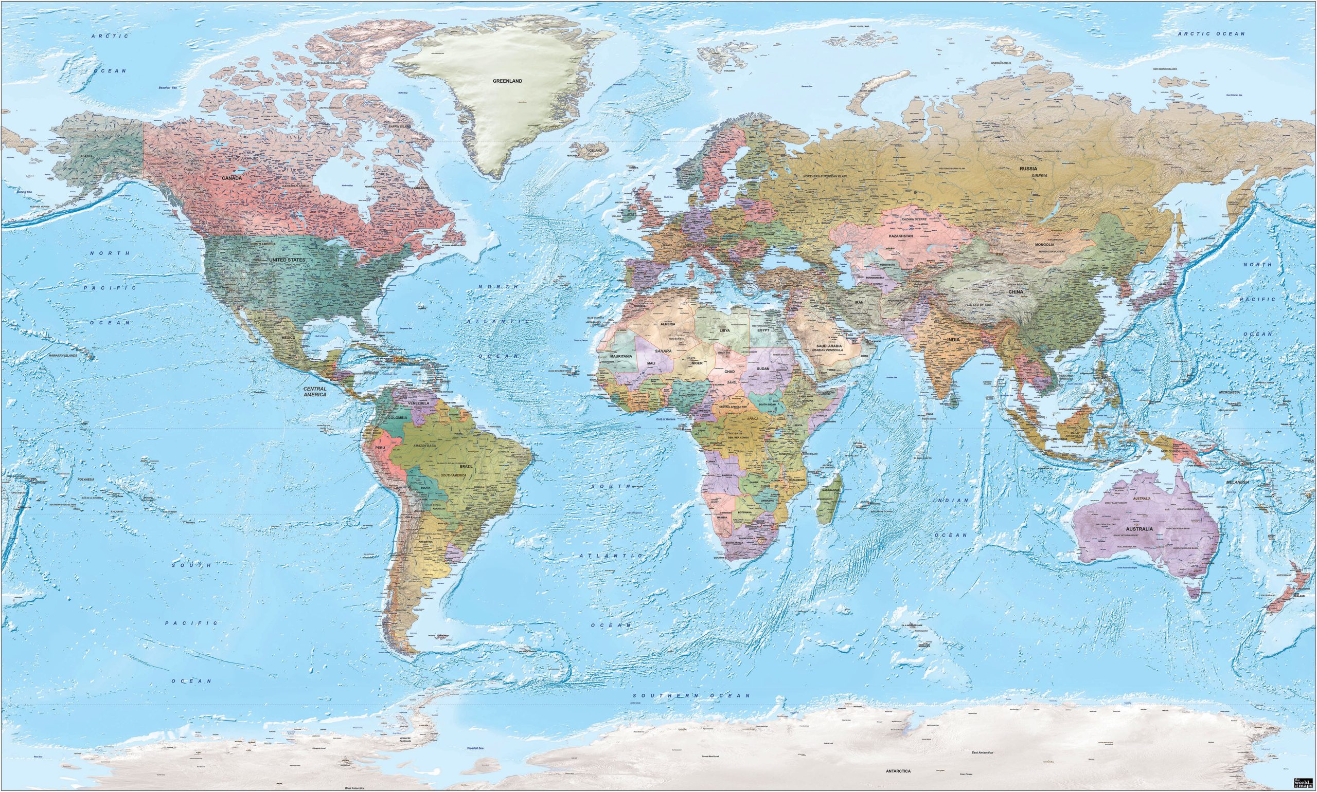 This digital vector map shows a modern political world layout with a high level of detail. A large number of place names are included, offering a structured and extensive geographic overview. Ocean depths are shown through calm shading, and major mountain ranges are depicted in slightly darker tones, giving the map a stronger and more defined appearance. The dark pastel colour palette provides a balanced and contemporary look suitable for design agencies, publishers and corporate environments. This digital vector map works well in both print and digital formats where clarity and detail are important.