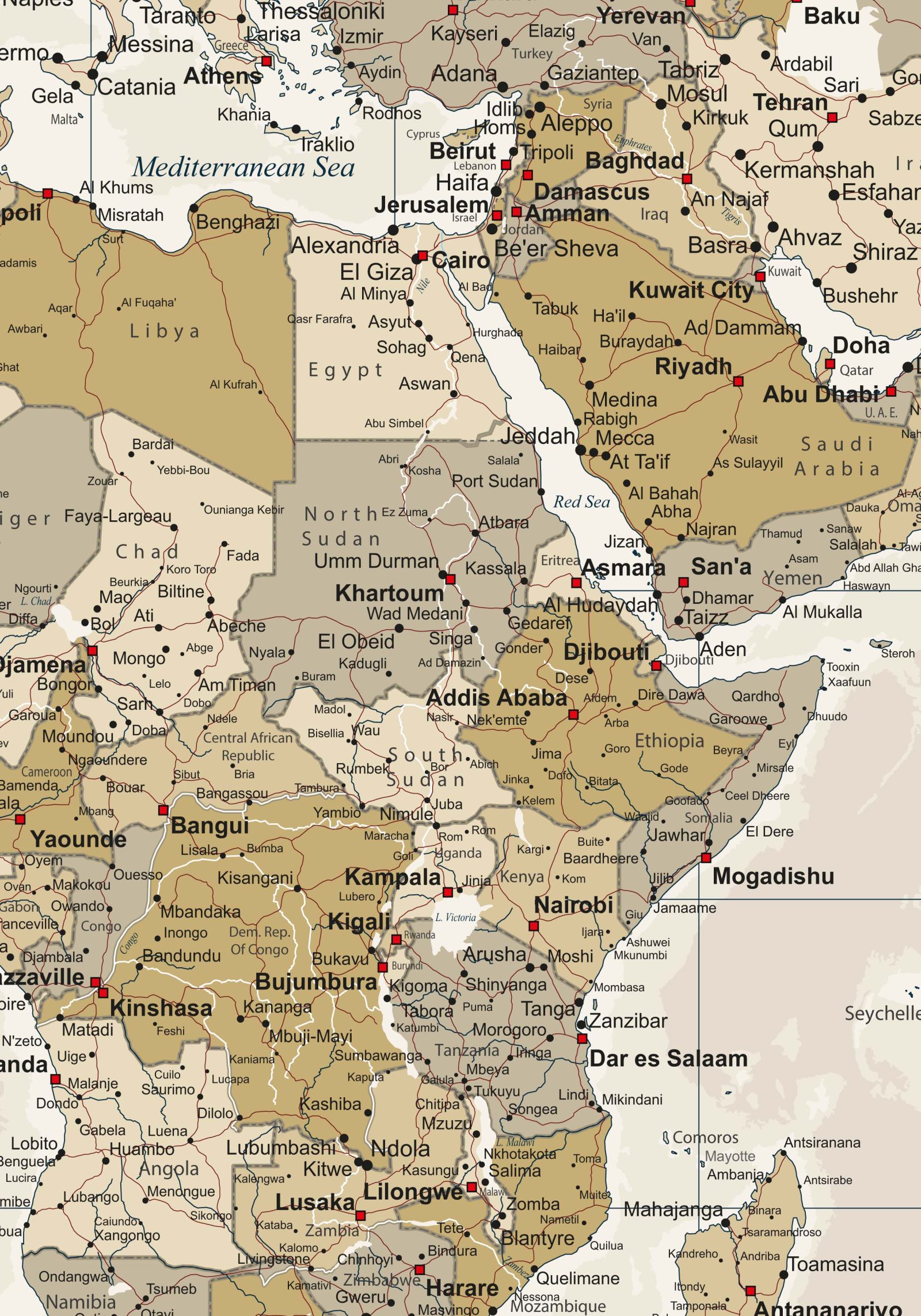 This digital vector map presents a political world layout in warm, nostalgic sepia tones. A large number of cities and place names are included, offering a detailed and structured overview suitable for professional use. Major roads and key transport routes are also shown, providing a clearer sense of global connections. Water bodies, islands and seas are fully represented and labelled, giving the map a complete geographic foundation. The digital vector map works well in both large-format designs and smaller digital applications, making it suitable for agencies, publishers and corporate teams.