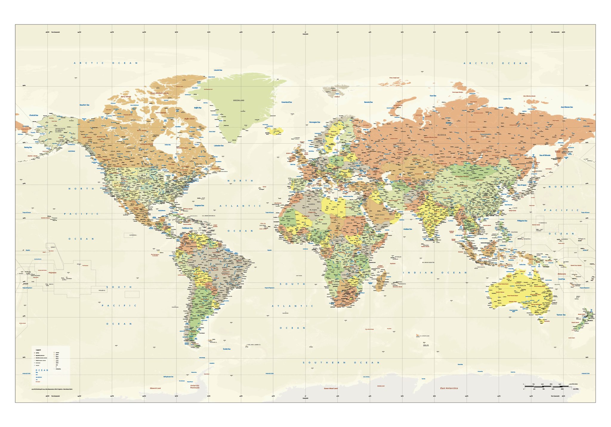 Our political world maps are available in multiple sizes, colour styles and detail levels, and each edition is provided as a high-quality EPS & JPG vector download, suitable for professional design and print work.